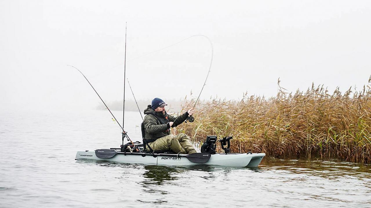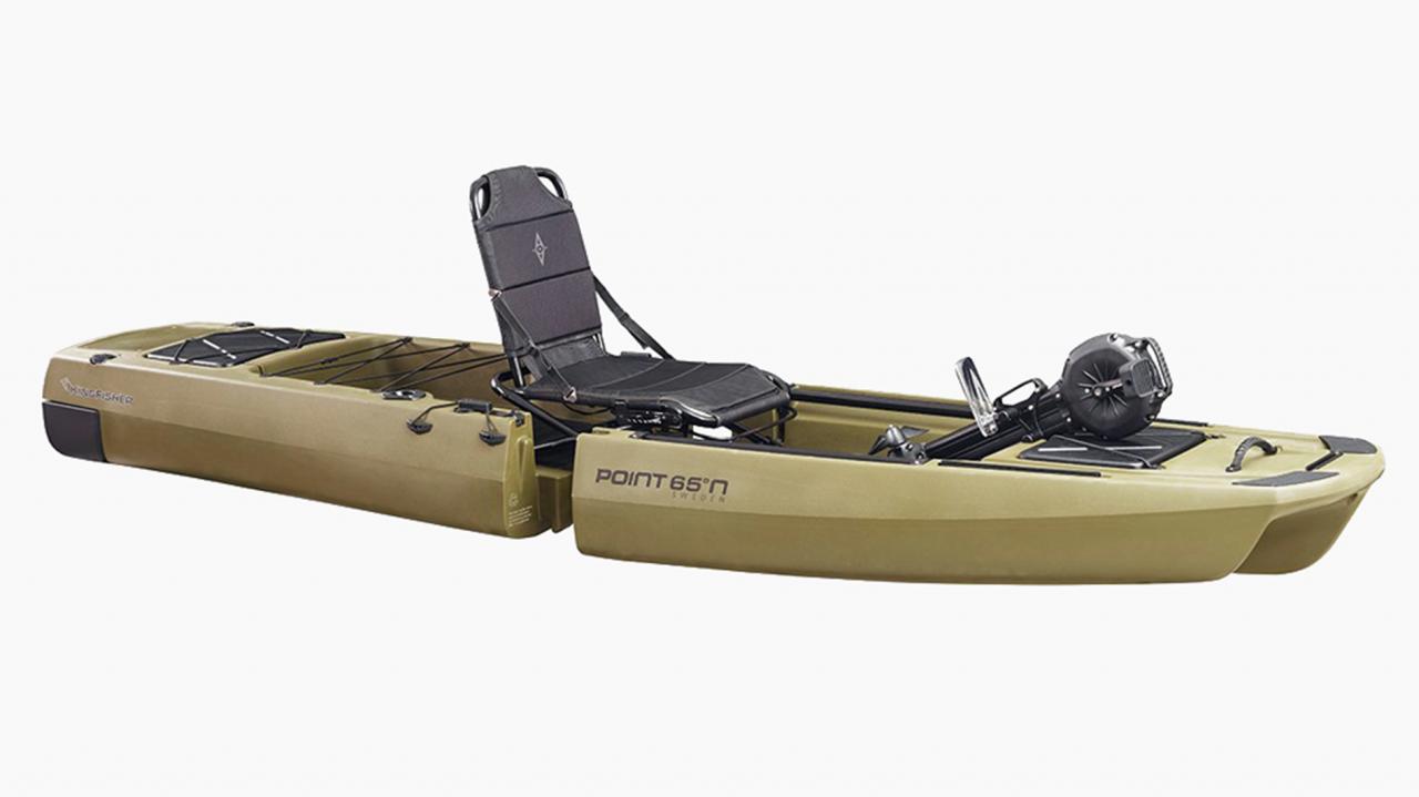 KingFisher 是瑞典公司 Point 65 Sweden 所開發的組裝式獨木舟,輕量、易拆卸、好搬運,除了用槳划水之外,多了腳踏踩水設計,讓釣魚者可以邊操作釣竿邊在水面上移動。