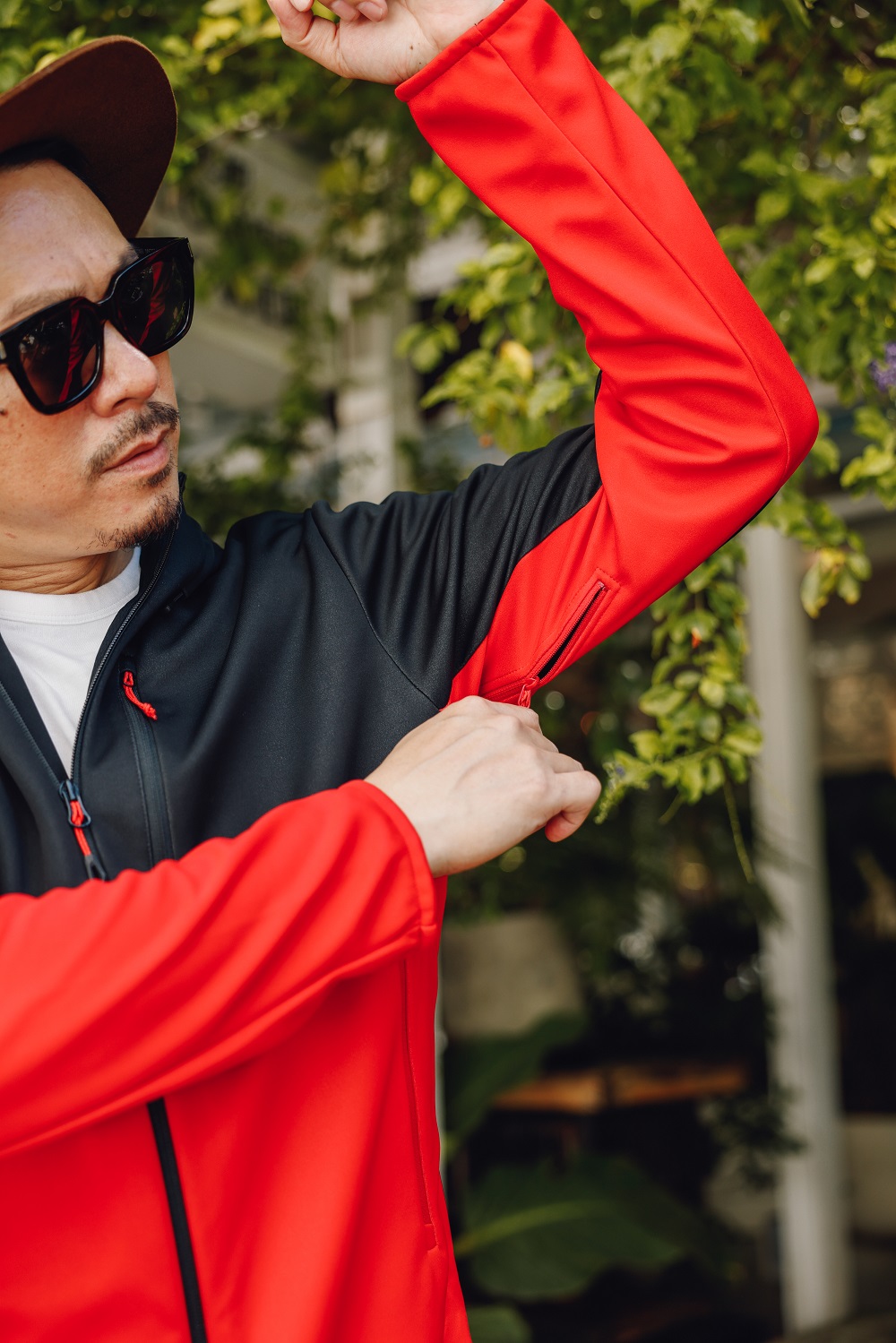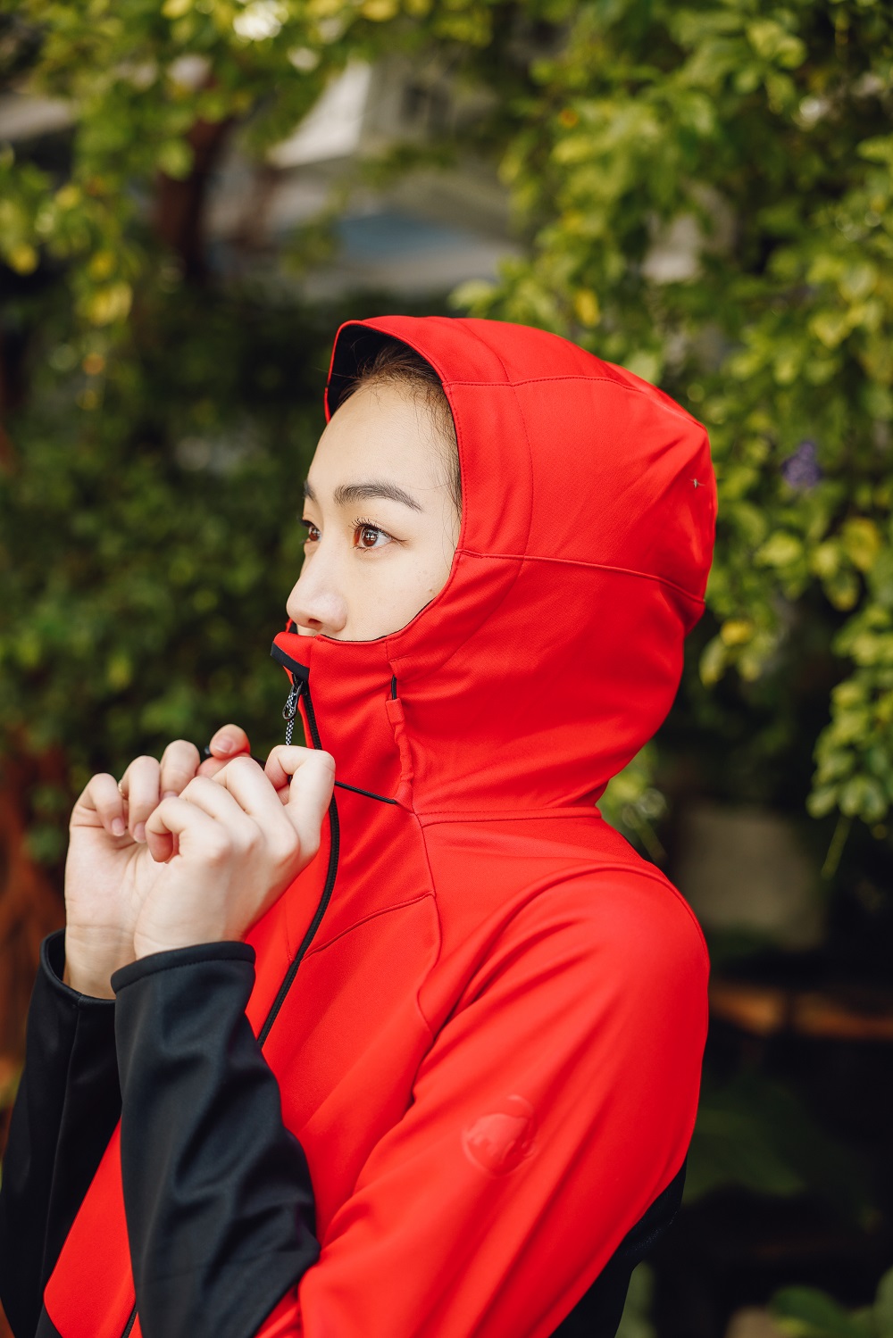 這次穿著MAMMUT 160周年紀念版的服裝,兩人第一眼看到都說「這就是我們的配色呀!」,本身就對黑紅配色情有獨鍾的Yorko,不僅品味眾所皆知,甚至擔任過日本知名訂製服品牌大使,當時也都是選擇黑紅作為搭配,稱為這就是標準的「紅水黑大方」,俐落的剪裁,Yorko笑說最近發福,想不到還有點修身效果。