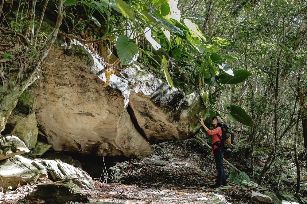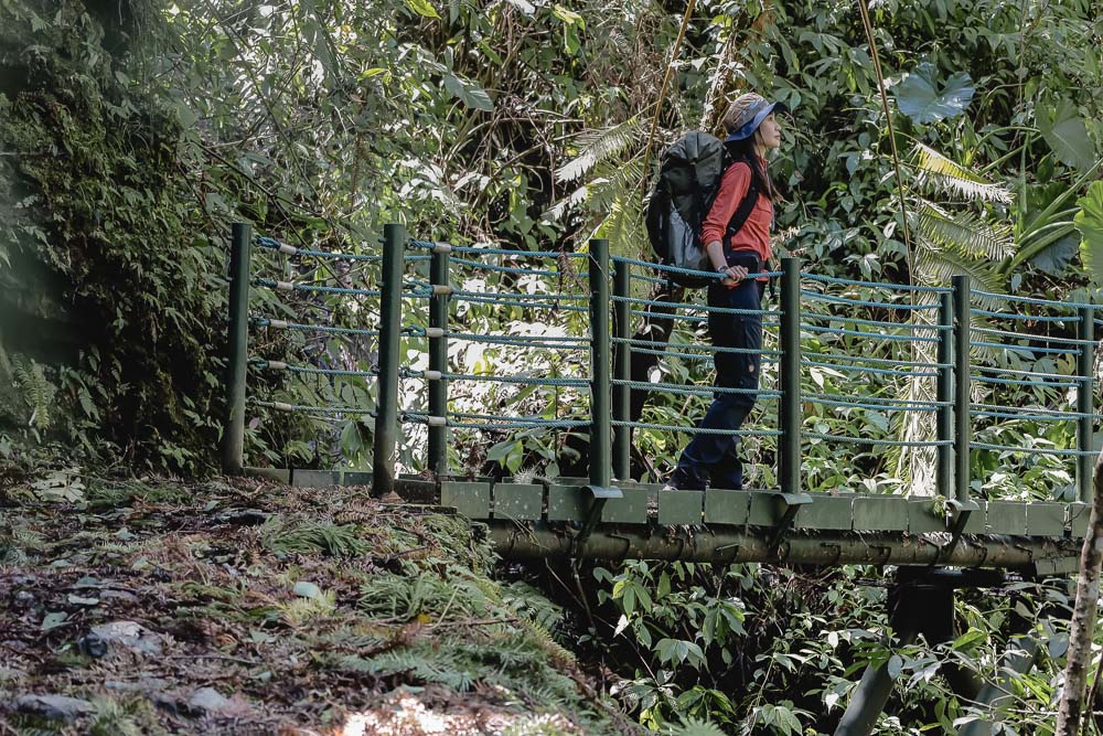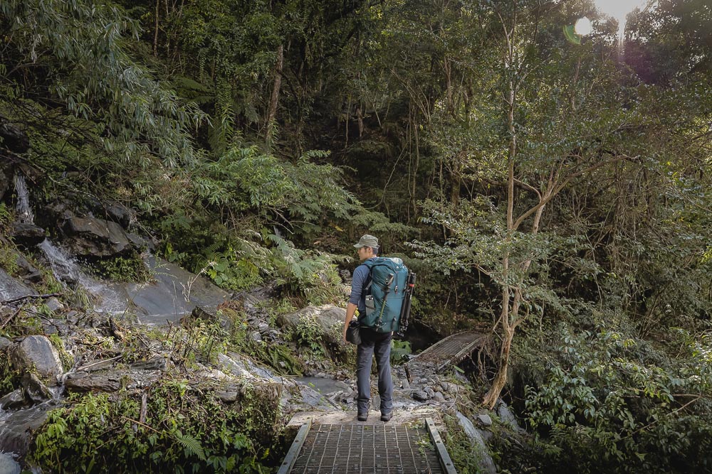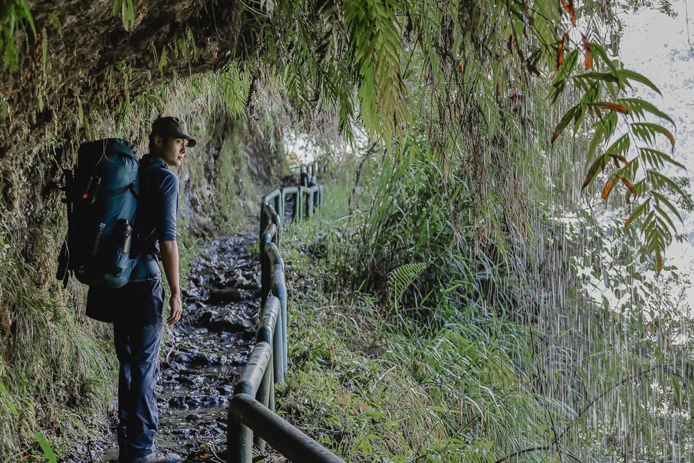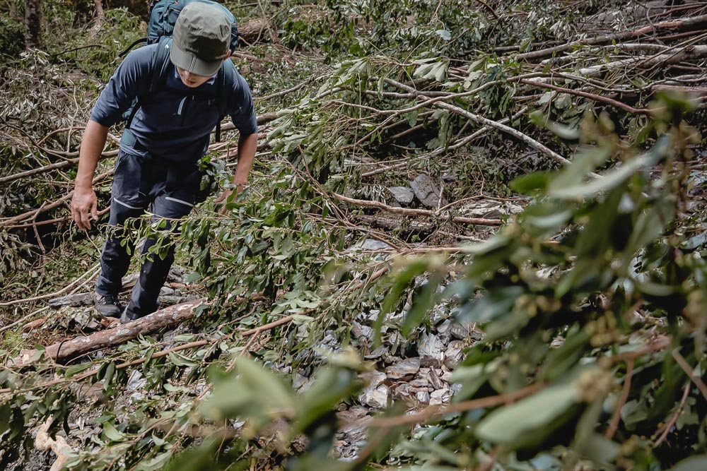 連日豪雨除了讓瀑布湧急,路徑成了小溪外,沿路還有不少小坍方跟大樹傾倒橫亙,大雨肆虐的痕跡讓後段行走多了一些挑戰,長袖衣物除了可防止樹上掉落的螞蝗,穿越倒樹也能避免刮傷,但若環境狀況較為複雜,還是建議多穿一件外層,也多一道保護。