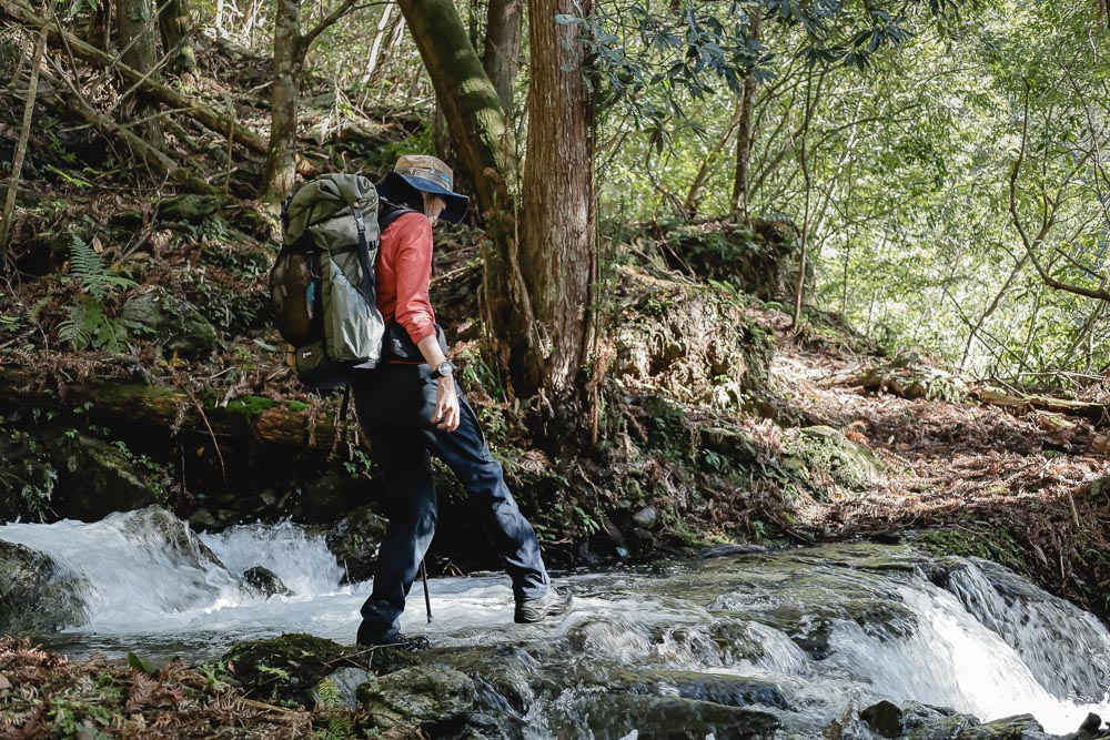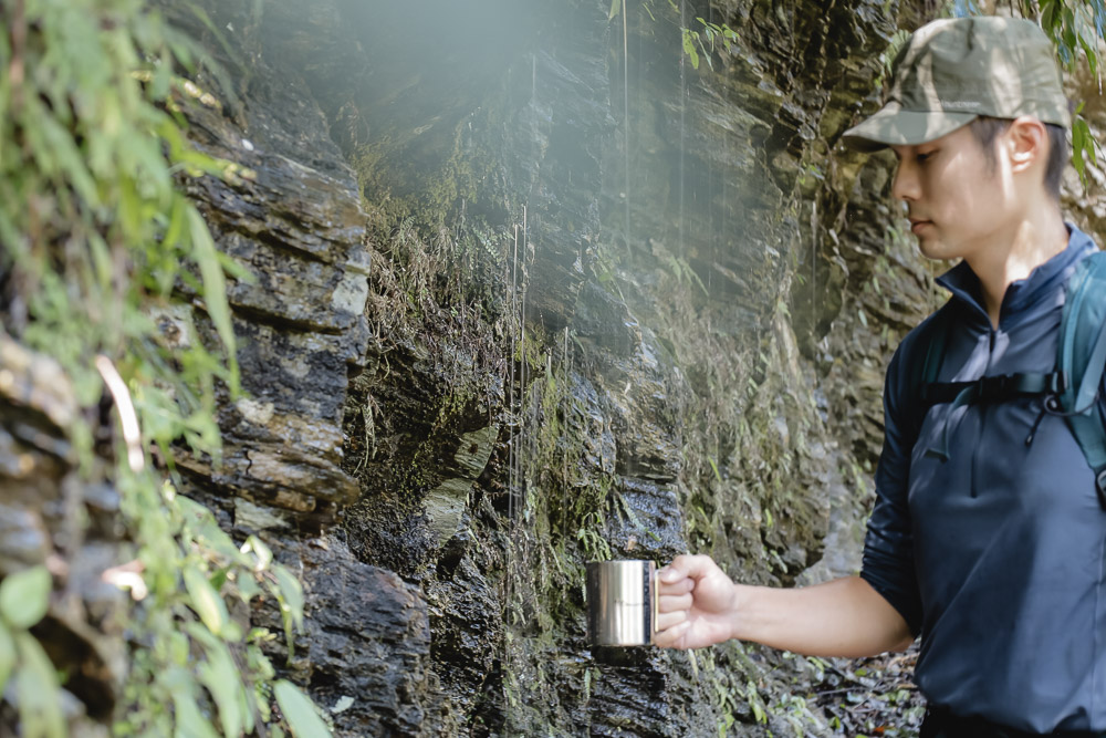 從登山口到佳心的這段路程因為不用申請,有不少輕裝來回的山友,揮別前陣子的壞天氣,上山的這天豔陽高照,因為位處在中低海拔加上重裝,走一段汗水便已經不斷沁出,加上山上豐沛的水量,讓沿線的岩壁都成了水簾洞,一路上淋了不少水,內外夾擊下, Mountain Stretch 排汗衣還是很盡責地表現完美快乾。