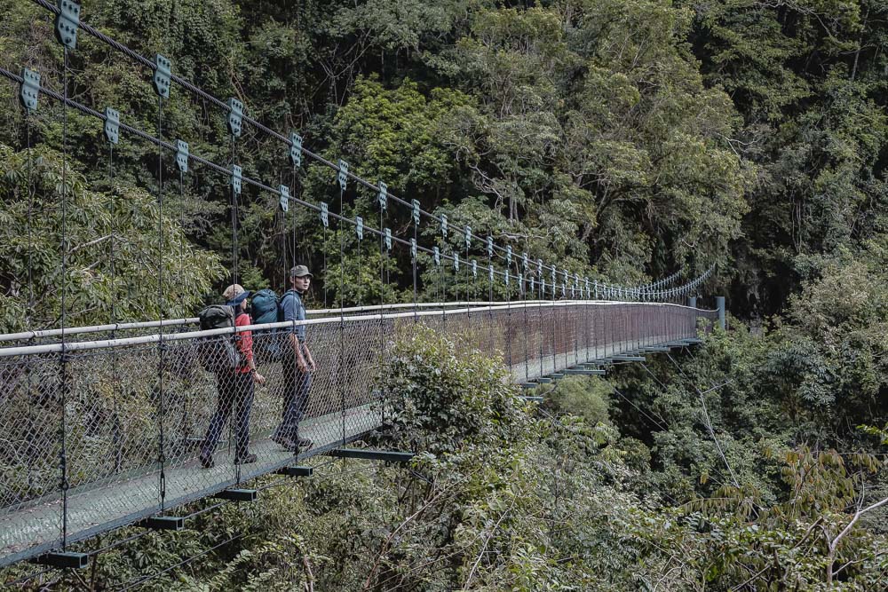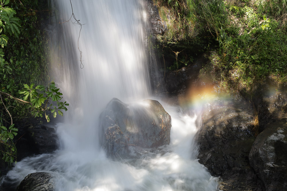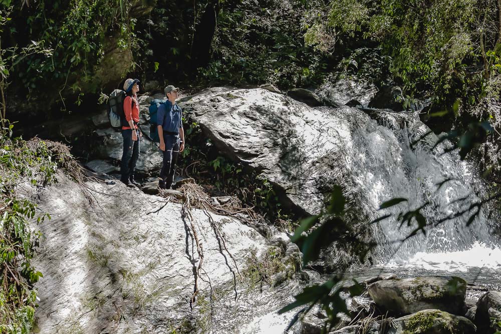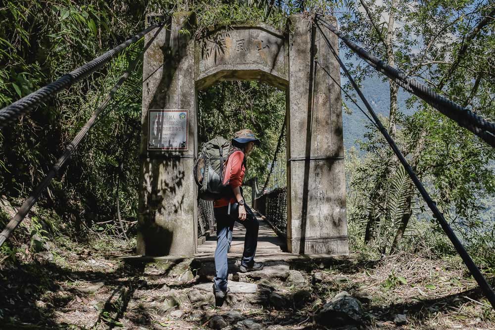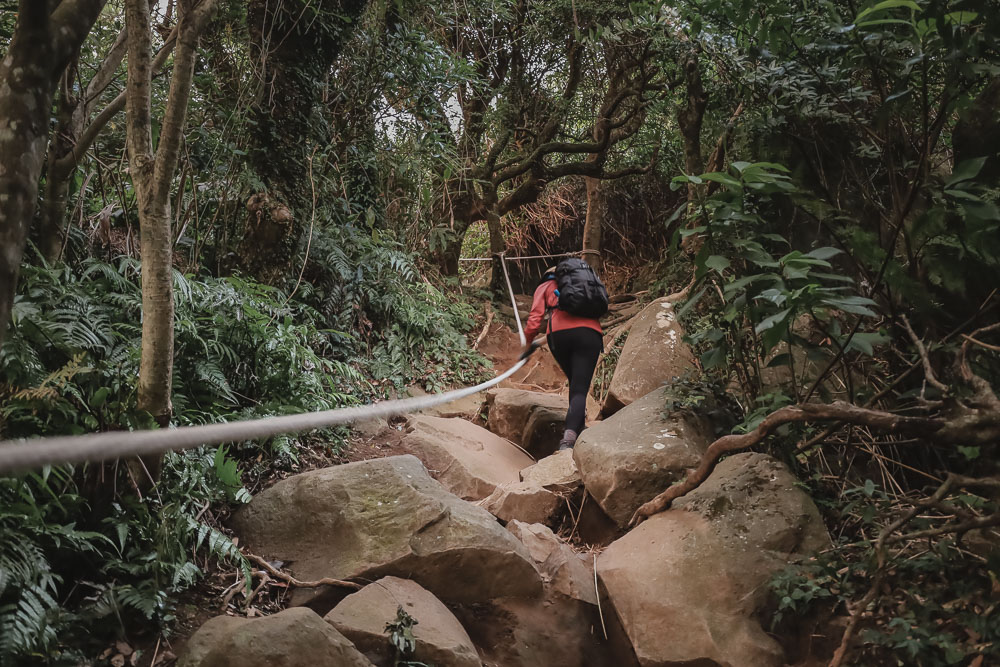 這次上山,沿路多處山壁都成了瀑布,順流而下也讓山徑成了小溪流,有些瀑布因為地形落差大而鋪上鐵橋,但這次我們或許碰上連日豪雨後才會出現的多道隱藏版瀑布,急瀉而下的水聲幾乎伴隨整段路程,一開始還會小心翼翼找水淺處踏石而過,久了我們也就隨性踩著小溪前行。中後段有道寬闊的瀑布溪流橫亙在道路上,湍急水流沖刷出較深的水潭,也只能硬著頭皮加速穿越。