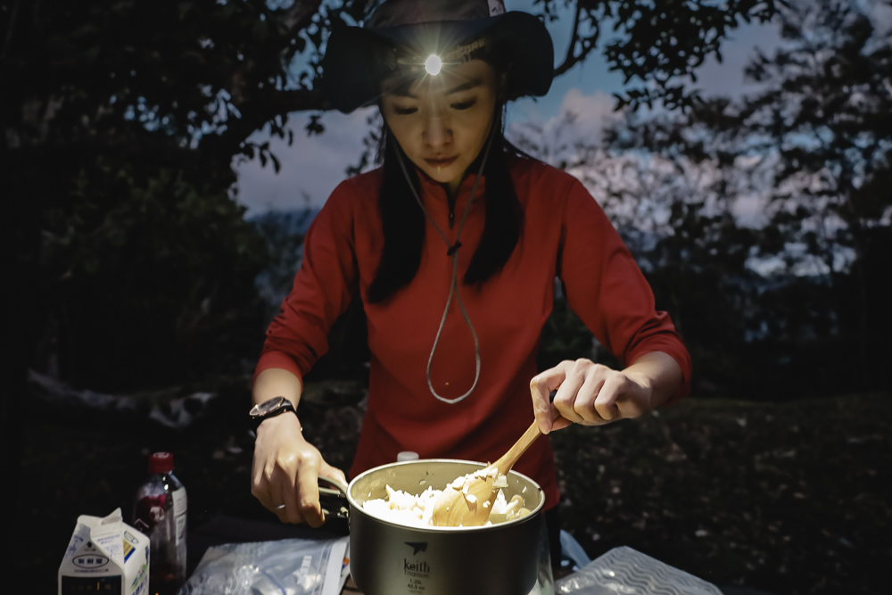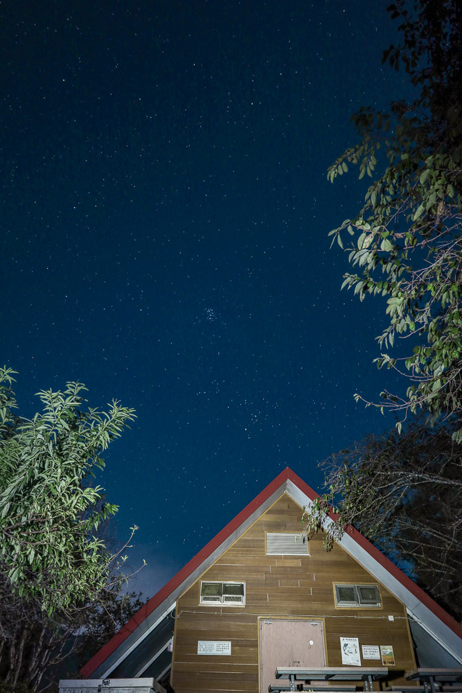 我們一到山屋後便趁著天未暗趕緊備餐,今晚吃的是豪華野菇奶油雞肉燉飯,等坐下來好好吃飯時天已經全暗,入夜後的深山氣溫很低,我們加穿一件保暖外套就很足夠。夜裡我們不約而同地醒了過來,便扛著腳架開始拍星星,我把高領拉鍊全拉起,再搭配一件保暖外套,雖然星星全被月亮的光輝給狠狠蓋過,但隨著疫情趨緩能在山裡過一夜就是幸福。