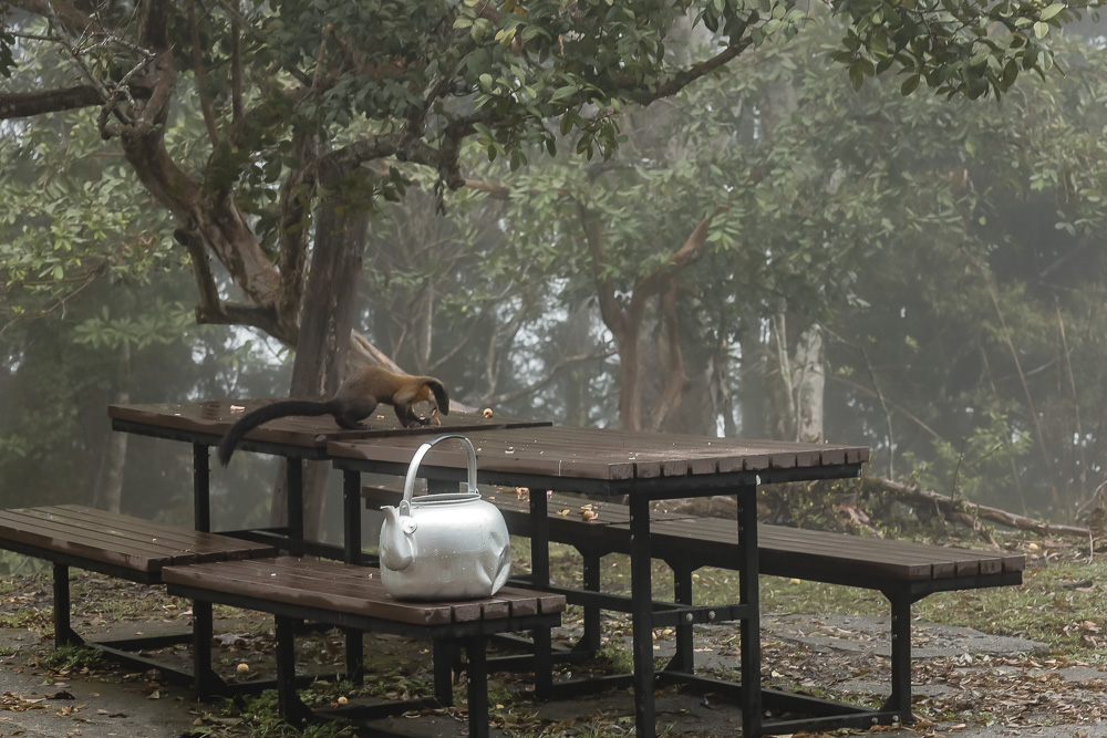 凌晨4點山屋外的雨開始變得急促,好在天亮後雨停只剩濃霧,我們吃著早餐,一隻可愛的黃喉貂繞著山屋跑,還跳到桌子上吃果子。這兩天我們雖沒見到黑熊(還好沒有),但遇見獼猴、藍腹鷴、擬龜殼花都讓我們又驚又喜。