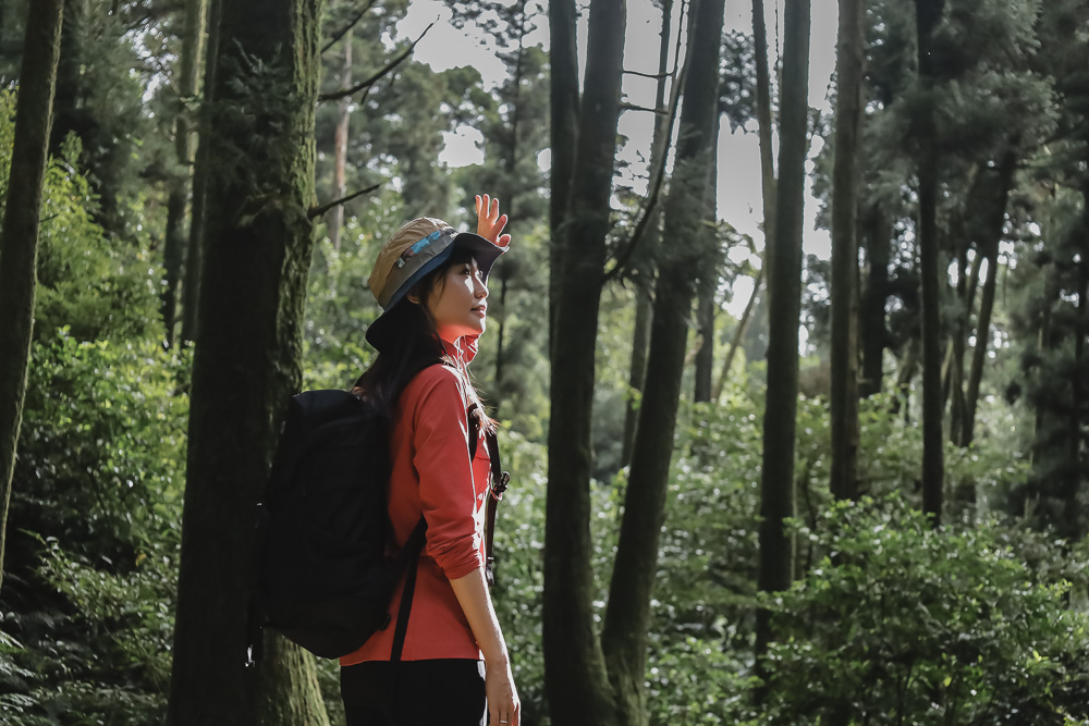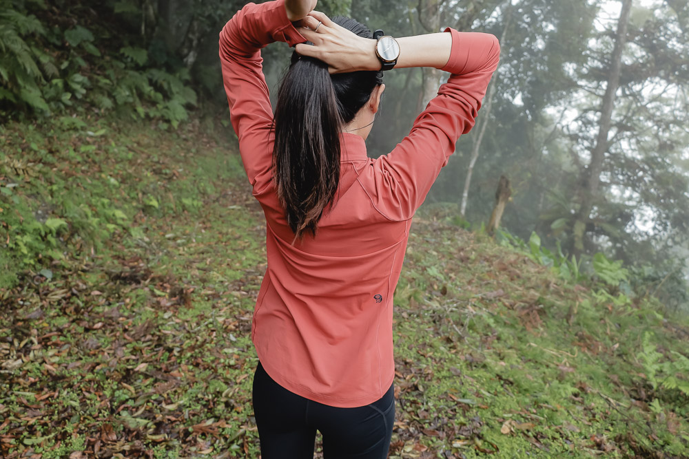 6:30起登沿路山友還不多,清晨起霧走在山林間有些微涼,我們身上單穿Mountain Stretch排汗衣,不用刻意穿外套,體感相當舒適。登山過程中常常會遇到清晨氣溫稍低,但穿上外套行走一陣子,身體熱了又得脫下外套的狀況,長袖排汗衣正巧提供適度的保暖性,等暖身完也不需要再下包包、收外套,只要將彈性袖子往上拉就很舒服。