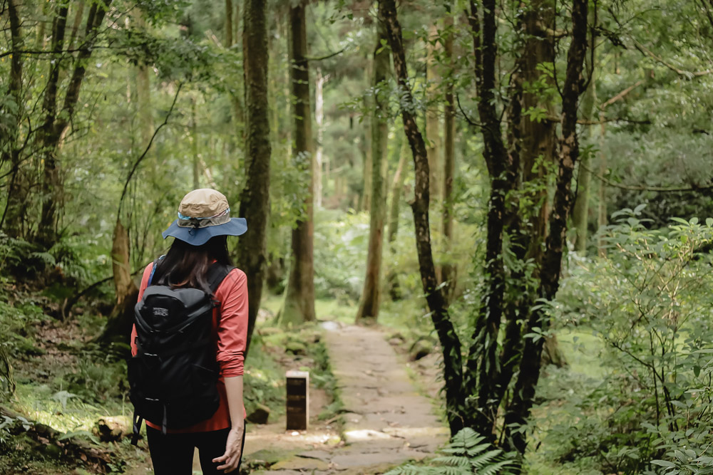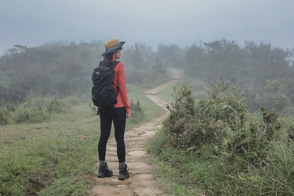 過了柳杉林,突然一陣大霧湧上,眼前的路瞬間變得朦朧,接下來的路程幾乎都是毫無遮蔭的路線,其實無論四季、郊山或百岳,艷陽天的長程曝曬對肌膚都是傷害,幸好陰天稍稍擋去今天陽光的熱辣。我一直都是立領長袖的愛好者,這對不喜歡擦防曬的我實在是福音,除了UPF50的防曬係數可以有效防曬外,面對變幻無常的天氣又能提供基礎的防風保暖。所以即使夏季,若事前規劃路線發現多是稜線無遮蔭,有時我也會直接穿著立領長袖的排汗衣,省去多加一件外套的厚重悶熱。