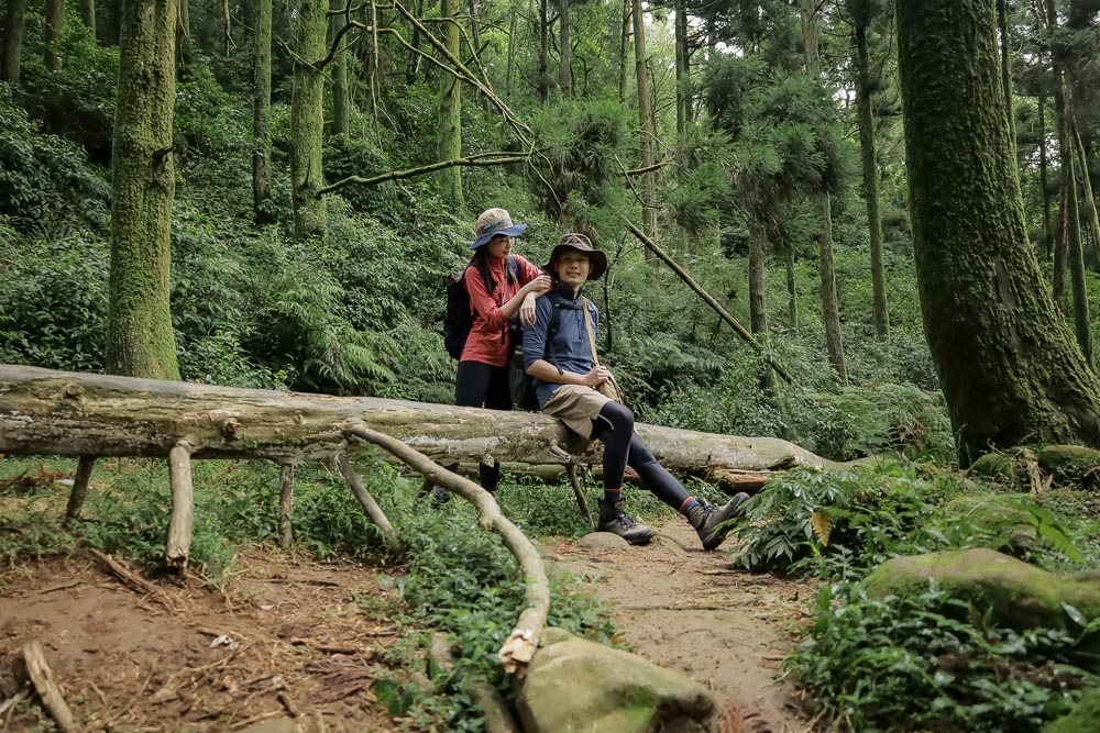 走到柳杉林陽光正巧從樹梢間透下,我們在這裡拍照玩鬧了一下,這一段是陽明山裡我很喜歡的山徑,優雅柳杉排排站聳入天際,怎麼拍都很迷人!