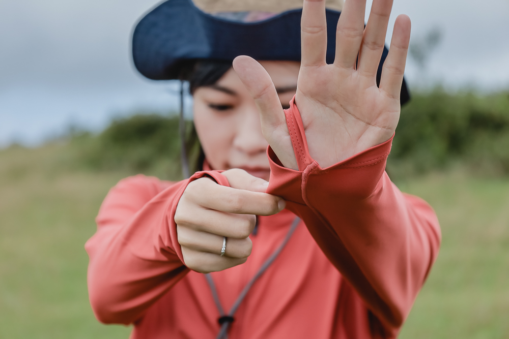 除了彈性纖維的包覆力外,同時設計拇指環增加服裝穩定度,移動時也不擔心袖子跑位,穿戴手套時更能完美貼合,除了可以避免冷風灌入,在陽光較強時,還能提供手背防曬。
