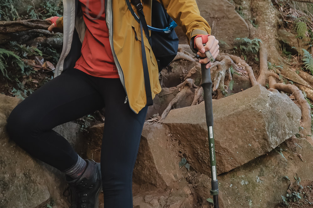 大屯山南峰、西峰的攀繩路線是整段大縱走比較有挑戰的地形,因為坡度陡必須拉繩索上下,身體必須大幅度的動作, Mountain Stretch 排汗衣彈性極佳,行動時不會產生限制,尤其是 Marrow stitch 車縫法讓接縫處觸感舒適,不會造成長時間磨擦破皮。