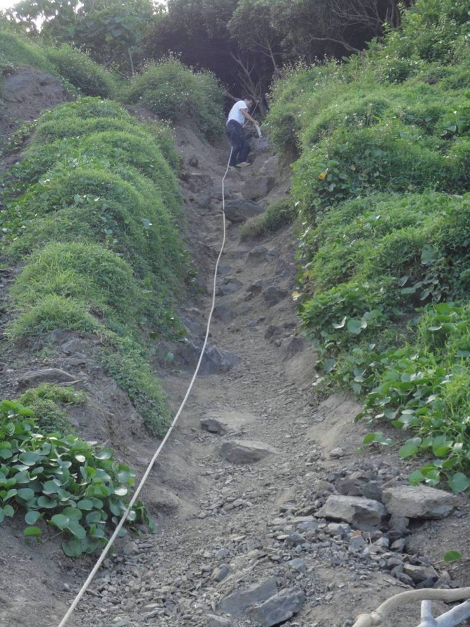 為避免滑倒,建議盡可能壓低重心,以側走方式下山,並注意不要踩在石面上,盡量挑選石頭與泥土的交界踩踏以增加摩擦力。