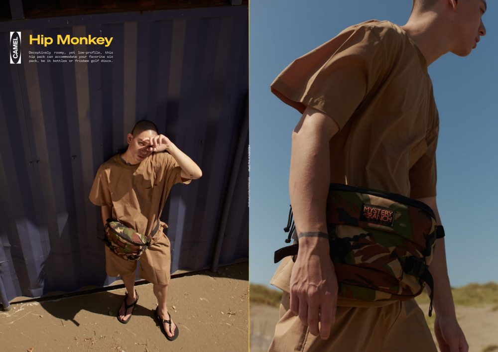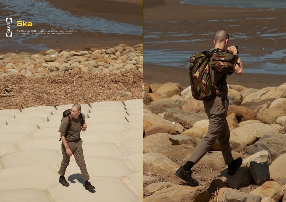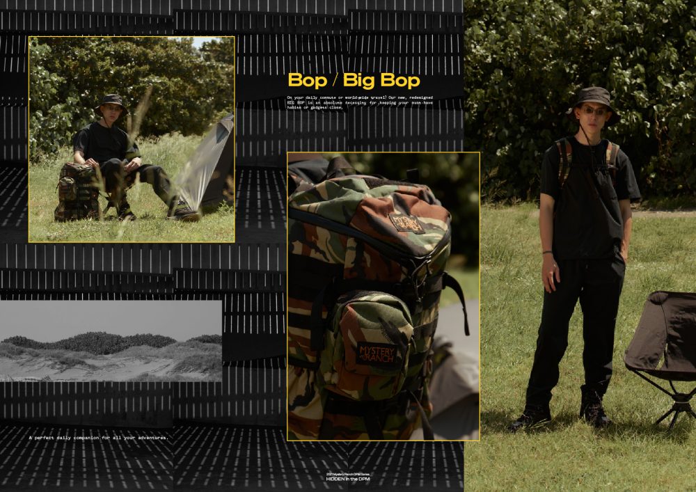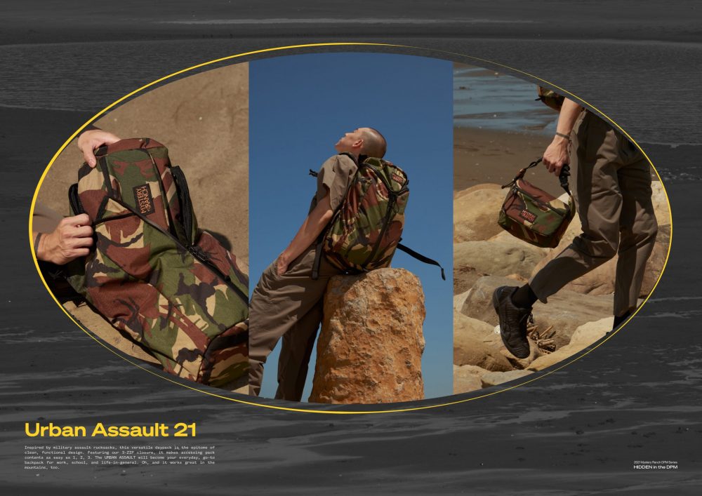 「HIDDEN IN THE DPM」概念形象以「隱匿」與「機能搭配」為題,透過三套單一色調機能服裝,搭配不規則色塊的DPM包款單品,穿梭在不同場景之間,營造出適合旅行/日常/野營的穿搭應用。