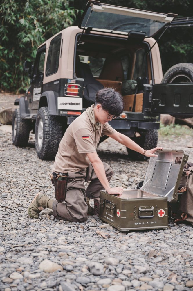 輪到嘉恩分享,他指著汽化燈,說那是可以讓野營氛圍瞬間提升好幾個等級的好用小物,同時,我們也注意到他格外熱愛老件,「對我來講,野營是一個與自然融為一體的過程。在大自然中,我想盡量避免太過現代、新穎的東西,加上我自己喜歡有歷史痕跡的物品,所以像是收納箱我是拿德軍的醫護箱充當;帳篷我也是拿軍幕搭設;砧板、餐盤我直接拿舊木板改造。」介紹完,嘉恩還補了一句富有哲理的格言、也是 Vintage Hunter 的品牌精神:「最奢侈的工法,是時間。」