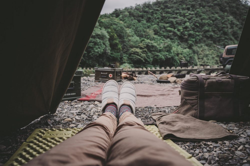 ▲穿著富有彈性又保暖的波蘿麵包鞋躺在營地,絕對是最舒服的時刻。此外,兩穿式設計更可便於進出帳篷。