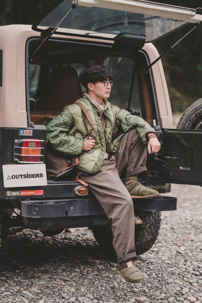 ▲嘉恩穿搭重點:以咖啡色系下身與淺軍綠羽絨外套做搭配,營造濃濃復古軍事風,同時,腳上的橄欖色 ReEmber 2 也與外套呼應。
