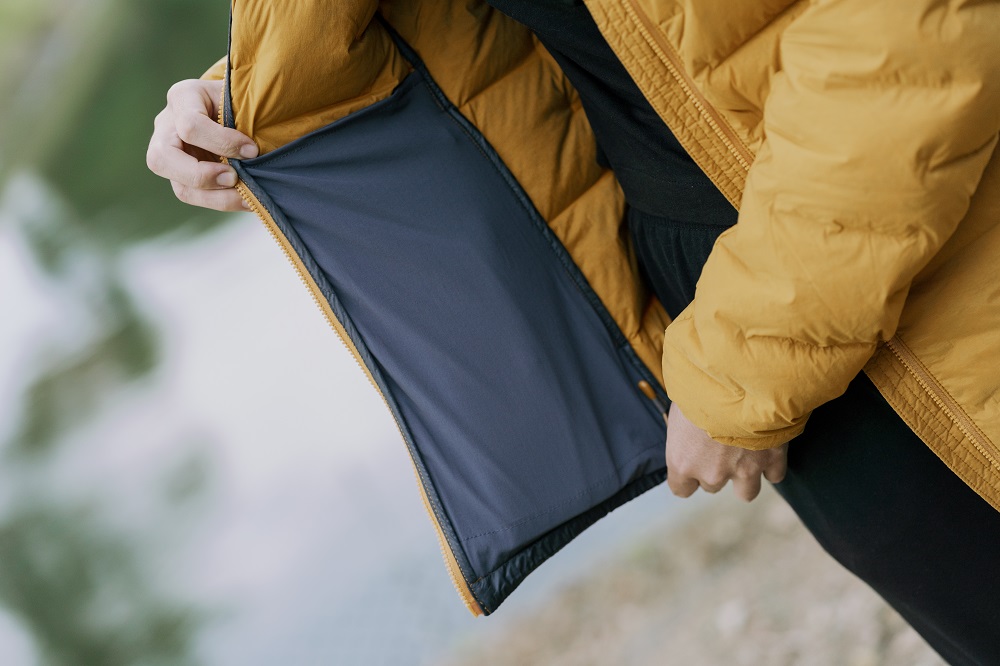- 700 Fill-Power recycled down環保羽絨(男款M尺寸重量為 173 克)提供溫暖並具有 Nikwax 的抗水處理