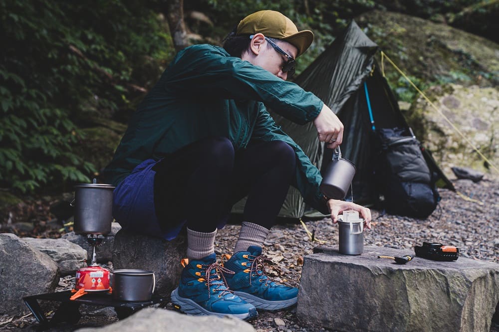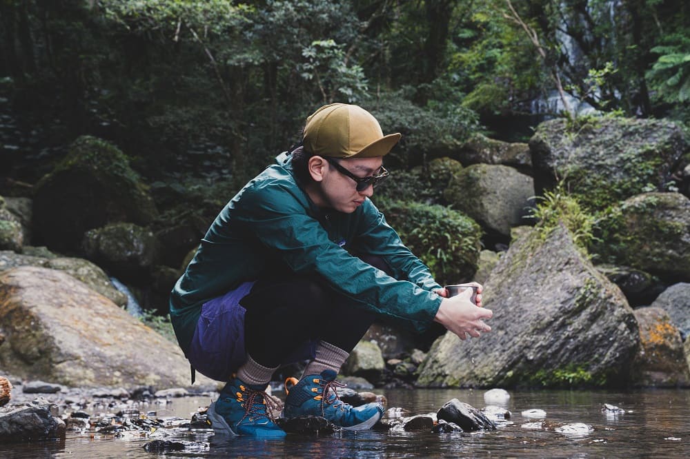 ▲喜歡冰涼飲品的NBJ,沖完咖啡後走到溪邊將咖啡冰鎮,腳上的 HOKA Anacapa 使用 GORE-TEX 防水面料以及防潑水牛巴戈皮革,可見NBJ踩進淺淺溪水中,也不會滲進鞋中。