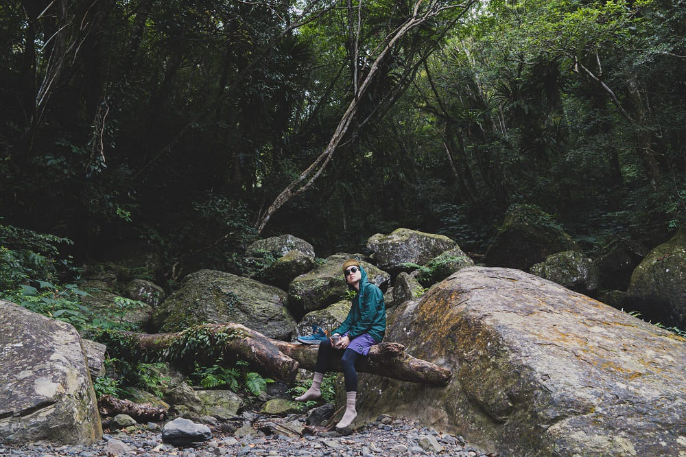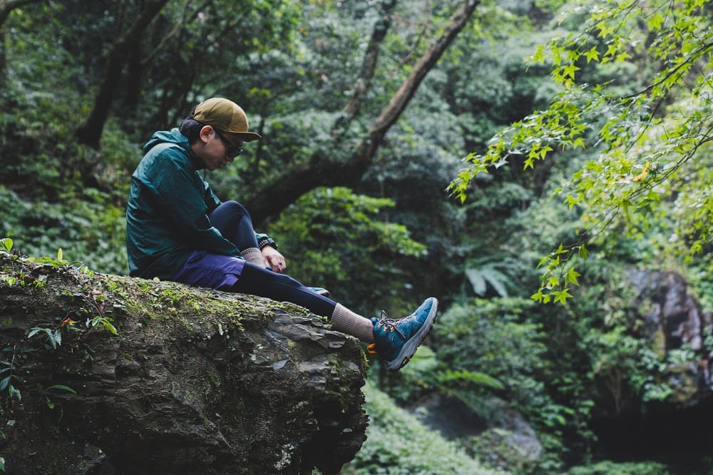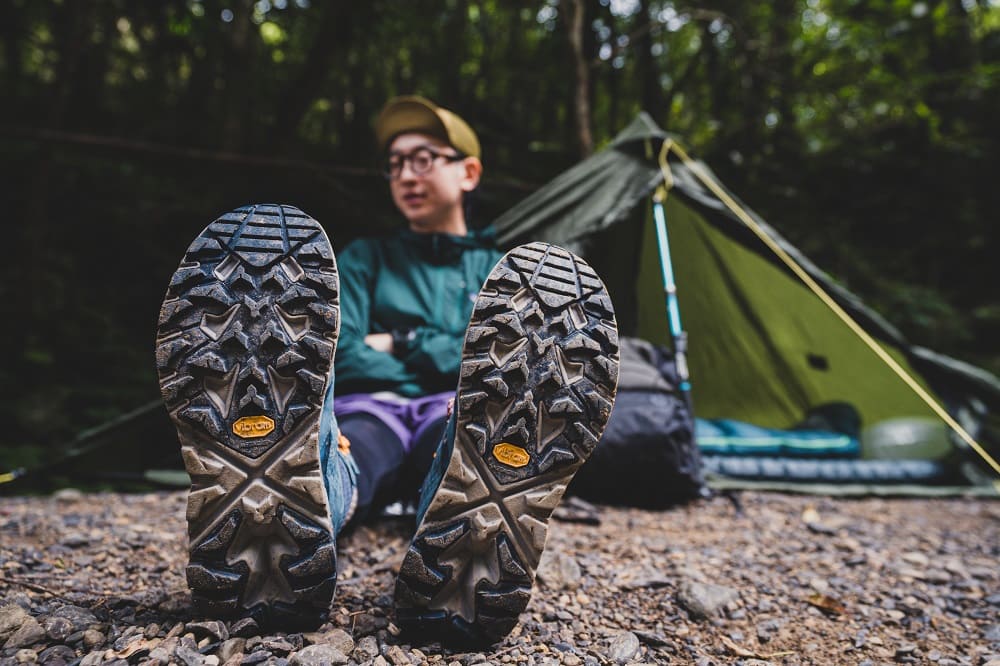 隨意找了石頭坐下,喝著NBJ為大家準備的咖啡,我們也暫時脫下鞋子感受大地的能量,NBJ拿起放在腳邊的 HOKA Anacapa Mid GTX (以下簡稱 HOKA Anacapa )跟我們分享,隨著登山裝備輕量化,重裝靴的出場次數也漸漸減少,如果是兩天到三天的行程,日常這種郊山健行鞋就能輕鬆應付,「腳上的負擔變少,不僅可以更靈活移動,也更有心力去好好欣賞山林美景。」NBJ從過去的心有餘而力不足,找到自己舒適的方式享受登山樂趣。