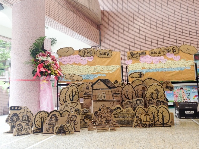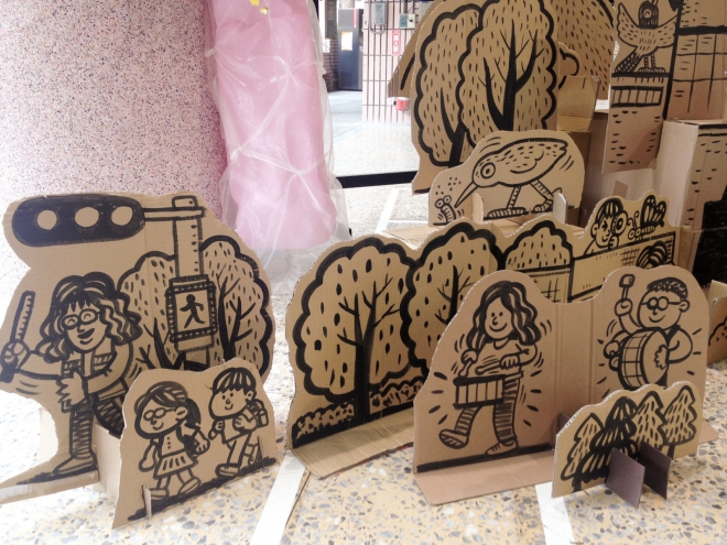 沈恩民的部落格曾分享了一篇很可愛的文章,關於他幫小孩學校運動會製作的手工布景。「我發現許多大型活動的布景往往製造過多垃圾,大家花錢去買一堆材料,製作成只能用一次的布景,活動結束就丟掉,對我而言就很像花錢製造垃圾。因此我從減少垃圾、垃圾再利用出發,利用回收來的瓦楞紙板,搭配手繪,以卡榫方式組裝起來。雖然過程中不免用到一次性材料,但比起傳統大圖輸出、珍珠板切割等作法要來得環保多了。」