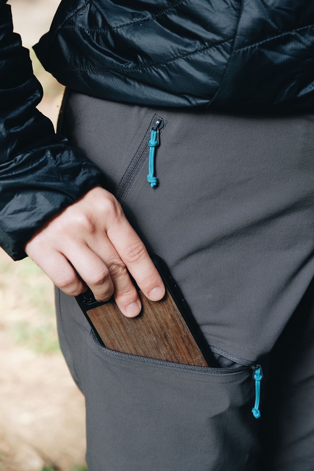 褲子有四個口袋,二個拉鍊襯裡插手口袋;一個拉鍊後口袋、一個拉鍊大腿口袋,皆都是 YKK® 製的,品質保證。 個人最喜歡大腿的口袋,放手機非常合適,手機的重量在腿的部分會比放在外套上來得更合適,且大腿的位置不會卡到背包的腰帶,放取都方便!