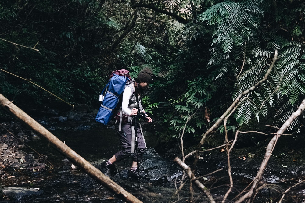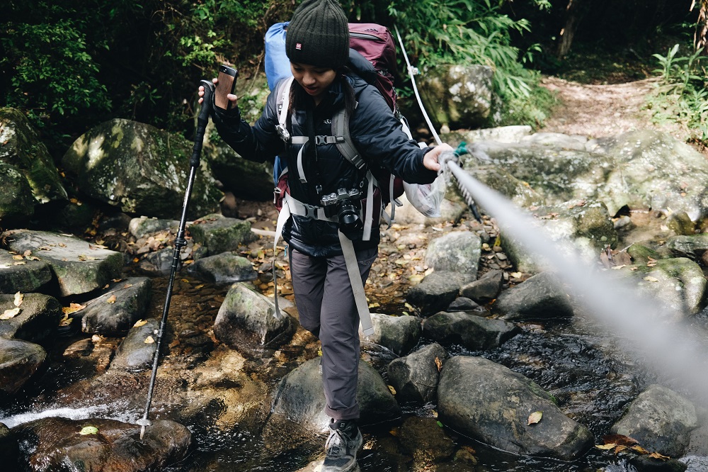 淡蘭古道到了後段有多處需要涉水過溪,把褲管捲上渡河。褲子的材質有防潑水處理,即使碰到一點溪水還是有快乾效果。