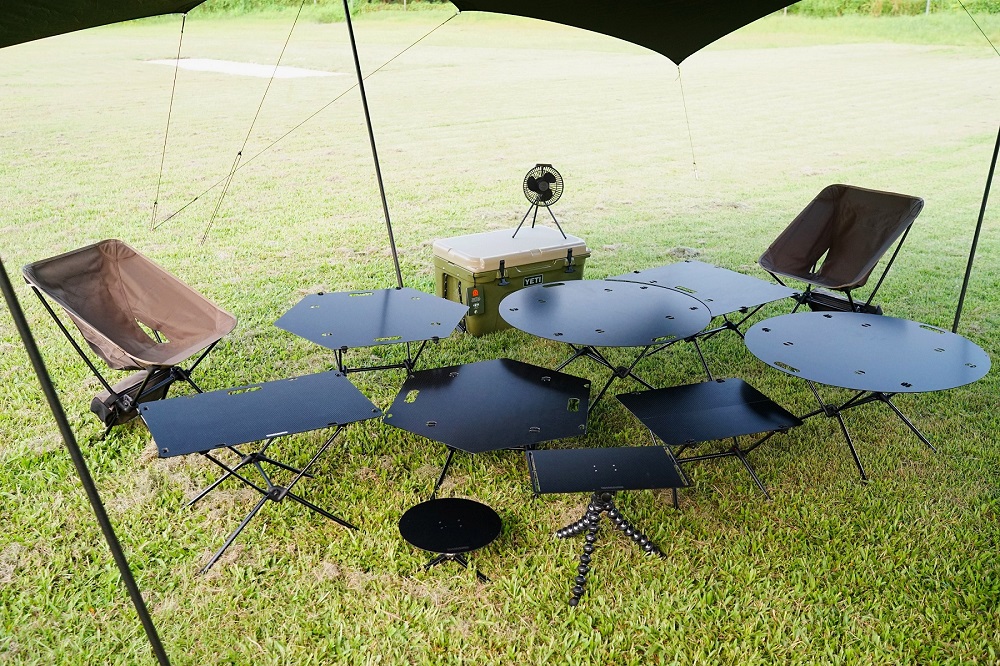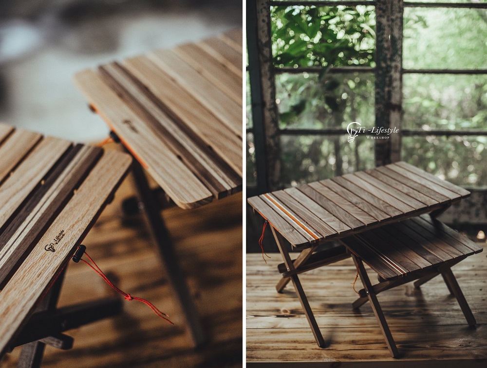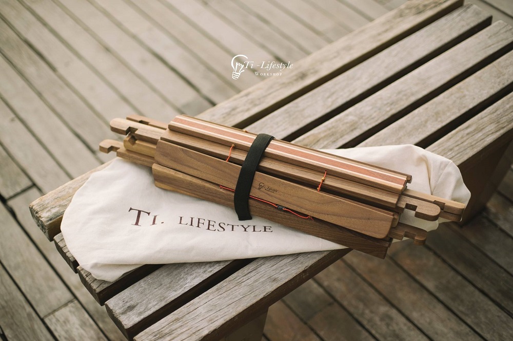 在美感與實用的考量下,皆挑選天然各種實木材料,白蠟木、胡桃木、櫻桃木,或是價格較為昂貴的花梨木,並配合線條圖形,讓整體裝備的質感更為提升,主打不管在居家或是帶到戶外都實用的折疊式木桌,以及其他木質裝備如砧版、托盤、杯墊等等皆為T.i-Lifestyle Workshop的設計產品。