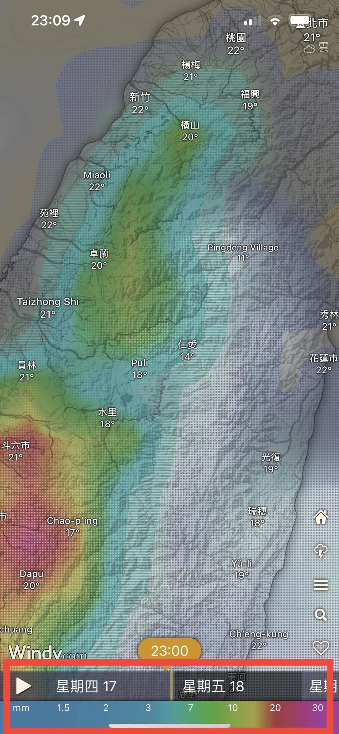 如果沒有特別設定,下方會有雨量的顏色示意,透過滑動時間軸,就可以觀察到雲層的移動狀況,以及哪個區域降雨量較高。透過這個方式,我們可以很直覺的看到特定山區的降雨量,以及未來時間是否有可能降雨。