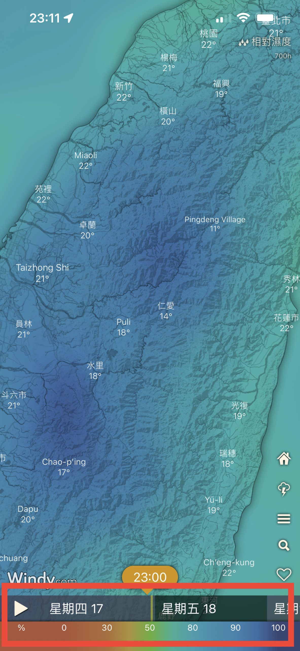 與觀測雲的移動一樣,滑動時間軸可以看到相對濕度的改變,搭配上述的簡易衡量標準,可以預測特定區域的降雨機率。