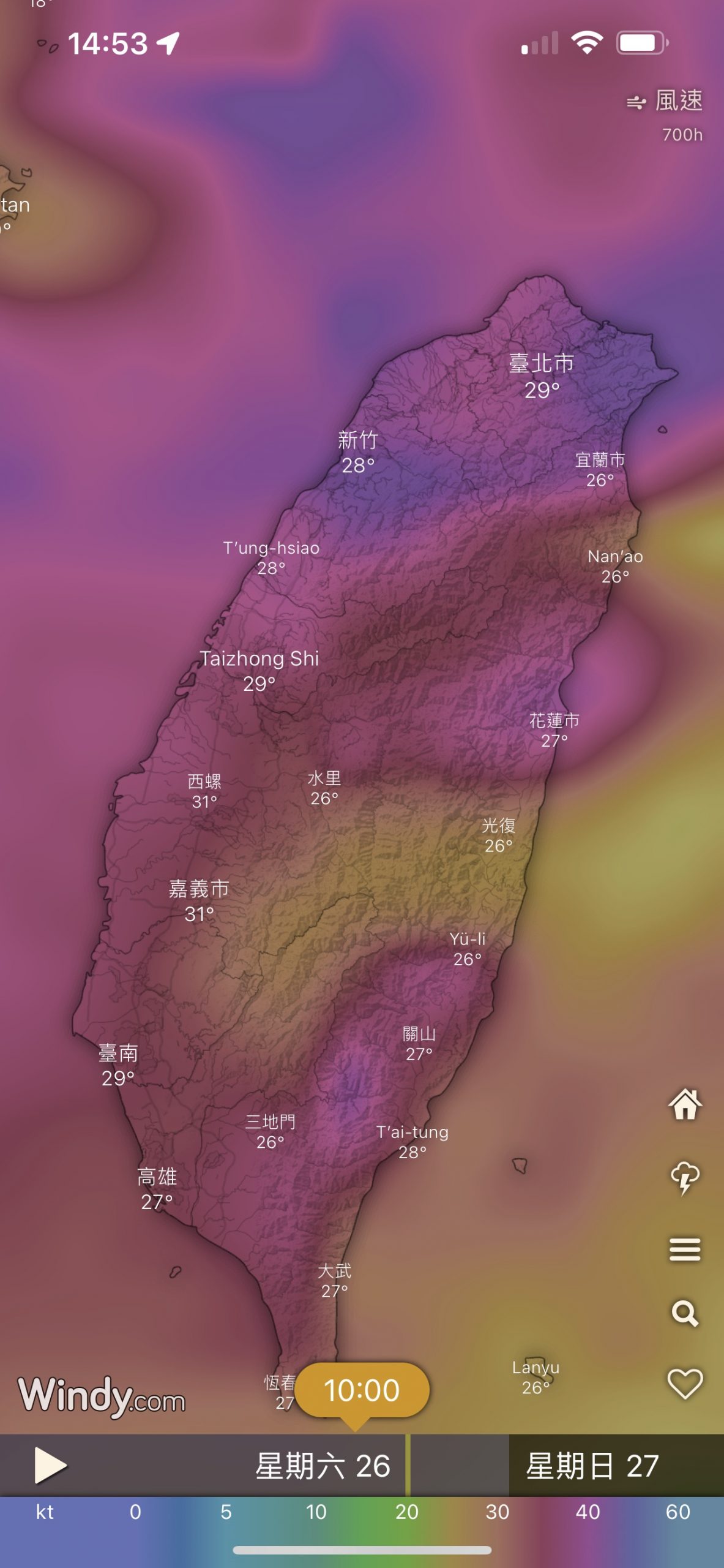※註:由於windy中的風速預設單位是「kt」,可以在列表中的第二個選項「設定」中,換成一般人較常用的「m/s」。