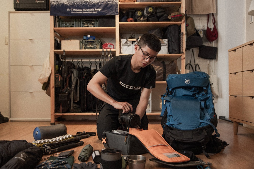 有些人為了減輕重量,會將相機等器材包覆在衣物中,但對於職業攝影師而言,相機終究屬於生財工具,特別是在多變的高山上,健健說自己一定會將所有器材放置在相機包中,確保所有器材能夠不受到外力撞擊造成毀損,為此,登山包也需特別預留放置相機袋的空間,健健也讚賞MAMMUT Lithium 50L的收納空間,不需用硬塞的方式就能輕鬆完成打包工作。