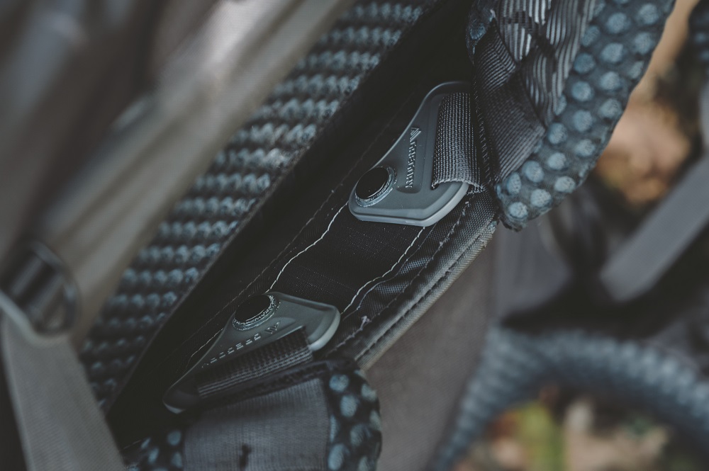 ▲自動調整肩帶:在肩帶連接背板的地方,可以看到有個會移動的三角形塑膠片,這讓肩帶會依據肩膀傾斜角度自動調整,讓背包在行進間可以隨著步伐擺動,讓身體重心保持平衡,進而達到省力的效果。