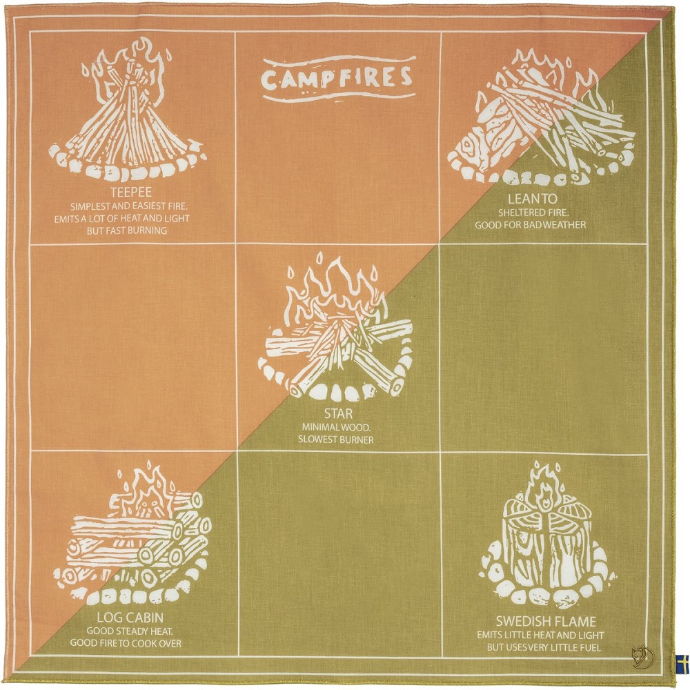 ▲Campfire Bandana,採用有機棉製成,搭配生營火的指導教學圖案。可用於圍脖、領巾、頭帶、鍋壺的握把、急救繃帶、背包裝飾…等等用途廣泛,這次上上除了將Campfire Bandana綁在TREE Kånken作為裝飾,增添個人化氣息;另外也將Campfire Bandana以對角方式折成三角形,從小的點開始,抓約2-3公分的寬度折疊翻轉領巾,並繼續翻轉,直到變成一條綁帶,將圍巾繞在頭上,並在中央處上打結紮緊,作為頭帶使用。