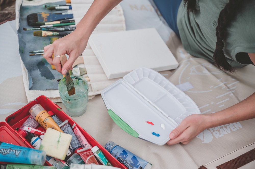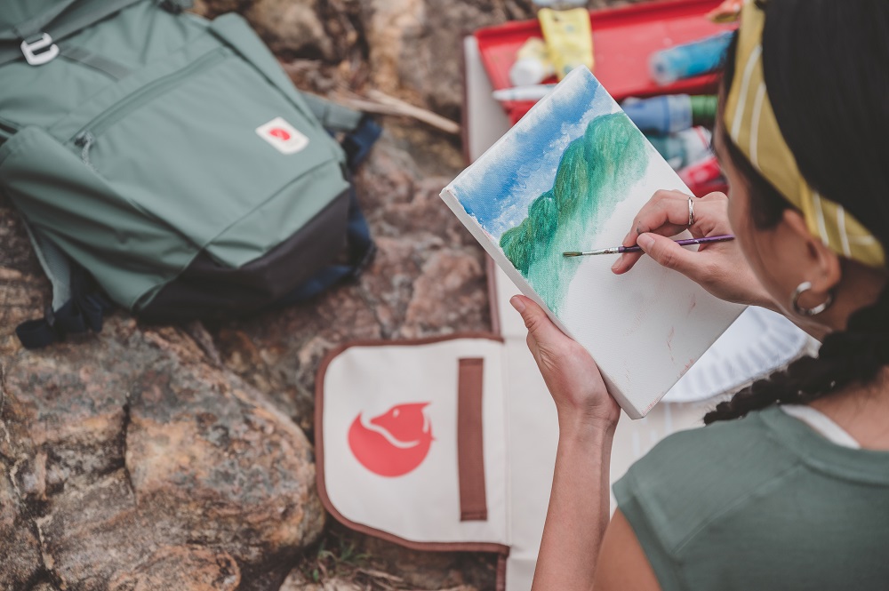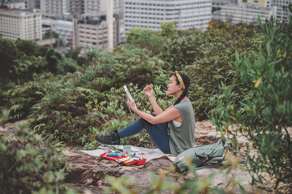 我們走到另一個可以眺望台北市景色的秘密基地,找了一塊平緩的岩石席地而坐,「你看喔,明明是同樣的景色,可是每個學員們畫出來的風格都不一樣,來到山女系,希望大家就跟手上的空白畫布一樣,不要給自己太多侷限,我們彼此都不認識對方,展現自己最真實的一面就好。」上上也拿出繪畫工具,一邊提筆作畫、一邊跟我們分享,即便是已經來過上百次的軍艦岩,但因為都跟著不同的人,大家都帶著不同的故事,每次來到這裡,都像初來乍到般新鮮有趣。