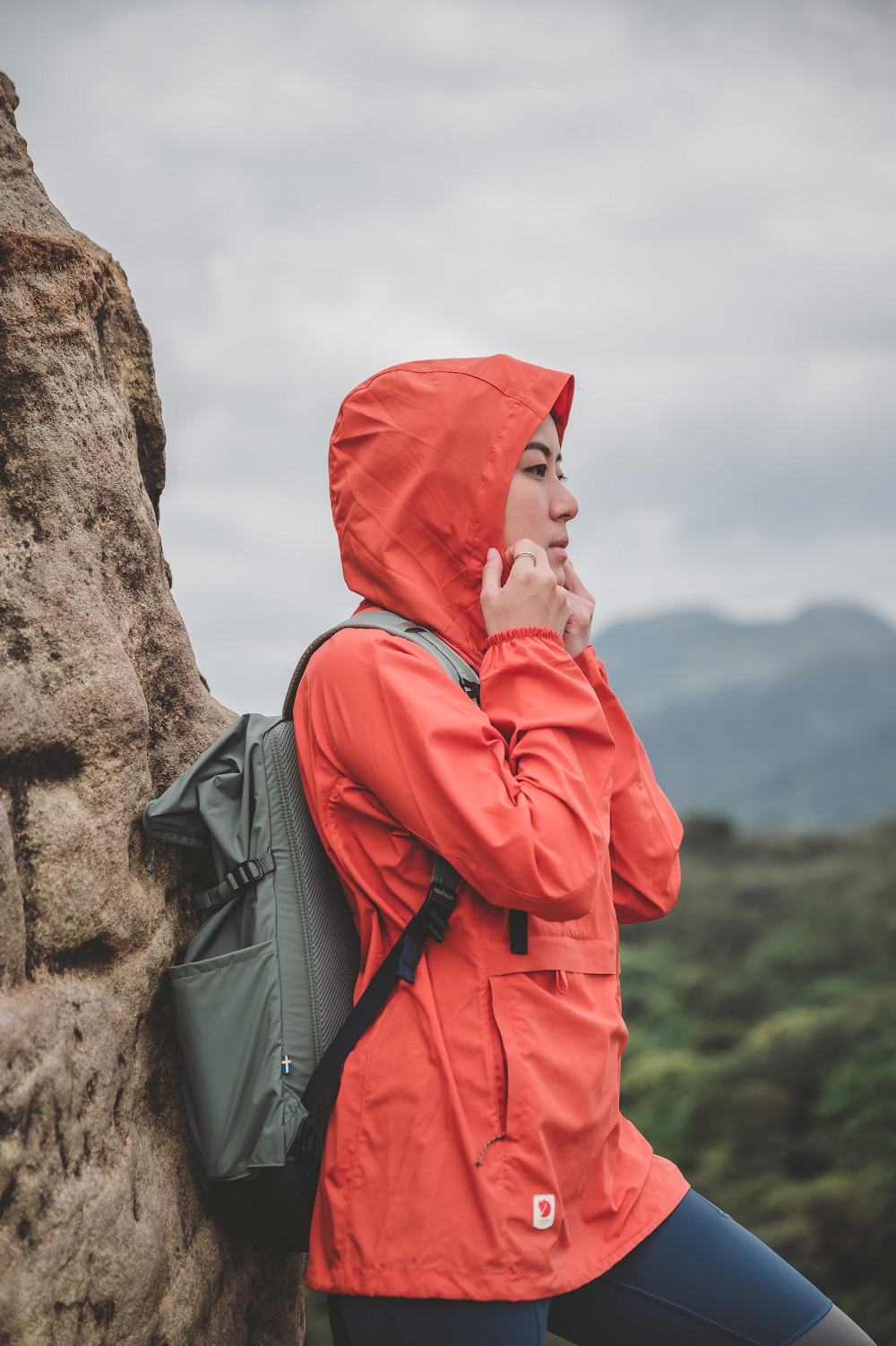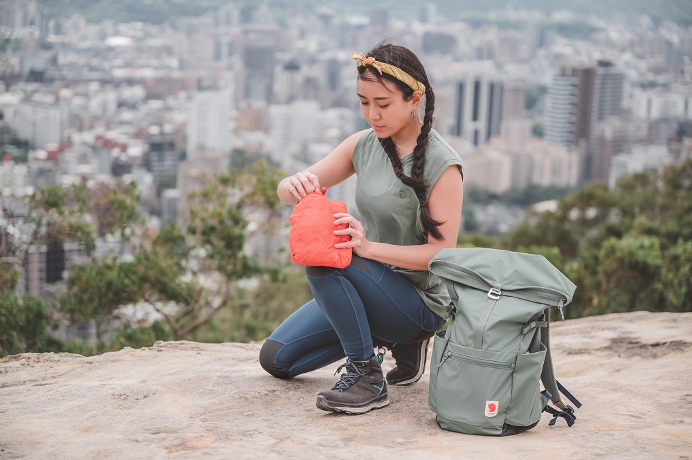 ▲防風外套:High Coast Lite Anorak W / 褲子:Abisko Trekking Tights Pro W / 後背包:High Coast Foldsack 24 / 配件:Campfire Bandana