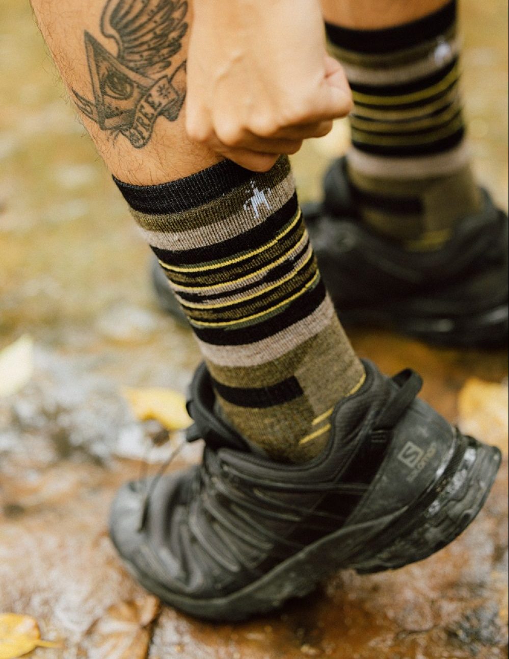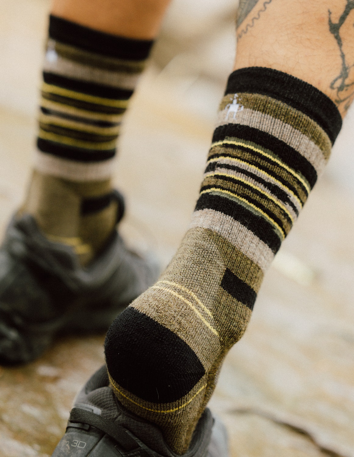 現在到戶外用品店,光是羊毛襪就有一整面牆可以做選擇,「除了搭配跳色的鞋子,還有涼鞋,或是日本流行的忍者鞋都很百搭,我覺得大家只是沒有想到怎麼搭,就自動把羊毛品項列在登山用品。」塏岳還另外分享,他也喜歡亮色系的戶外裝備,他有一個橘色的登山包,襪子也會一起搭配橘色,襯托整體亮點,也可以巧妙地讓別人注意到他的裝備。