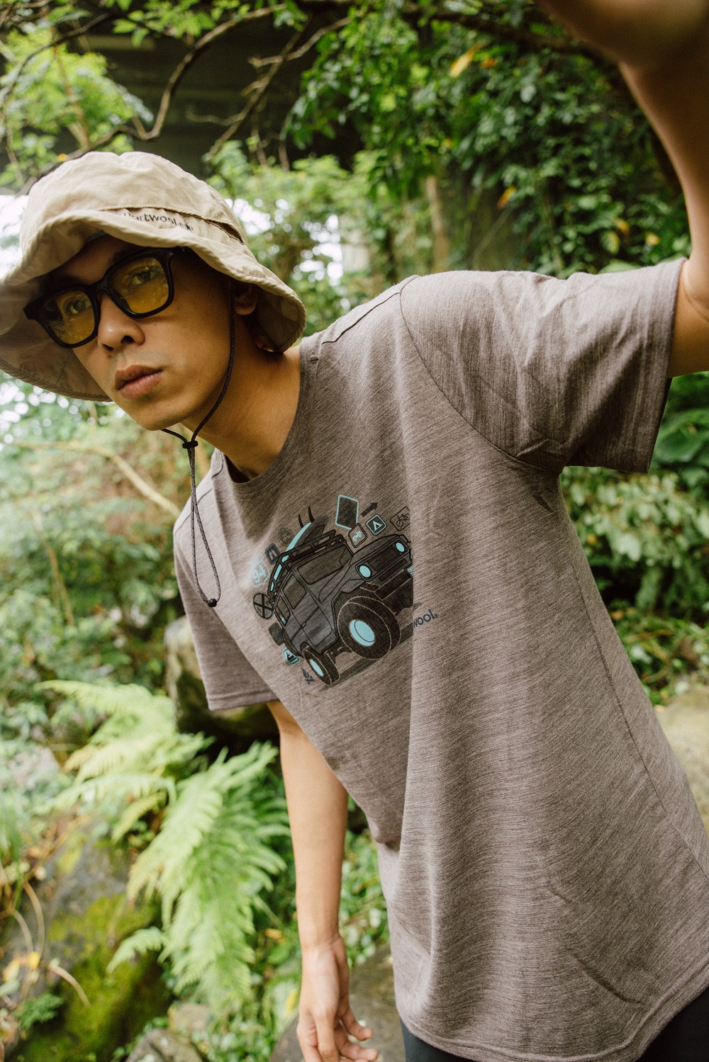 ▲Smartwool Merino Sport 150 塗鴉Tee,有多款顏色及塗鴉,塏岳今日示範穿搭為「吉普車冒險」,一行人開著車,來到溪邊來場夏日消暑的午後!