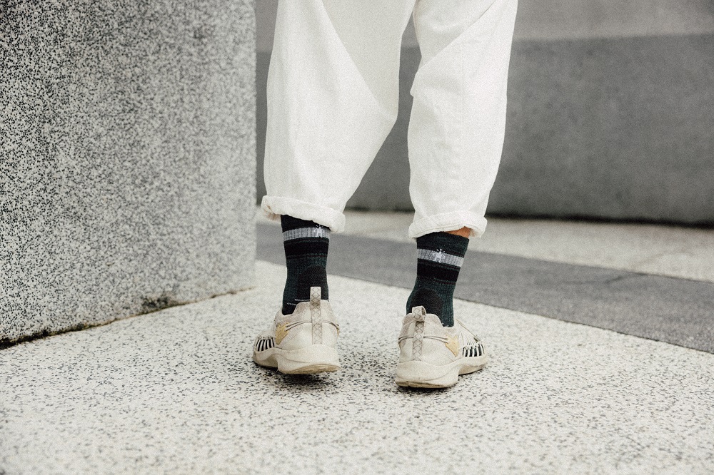 ▲將白色寬褲反摺,露出腳踝也不忘搭配一雙色彩對比較強烈的襪子,凸顯細節。Smartwool戶外全輕量減震條紋中長襪,強化腳跟、腳趾與腳掌區結構,增加耐用度。網狀透氣區塊增加透氣度,即便是夏天也能穿著羊毛襪。