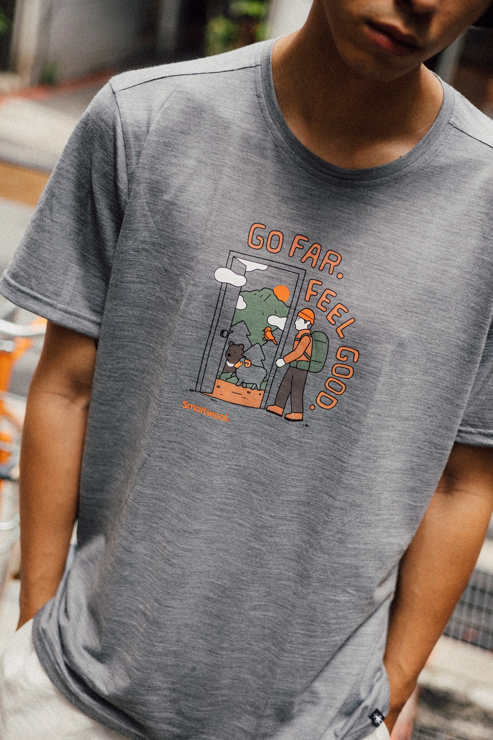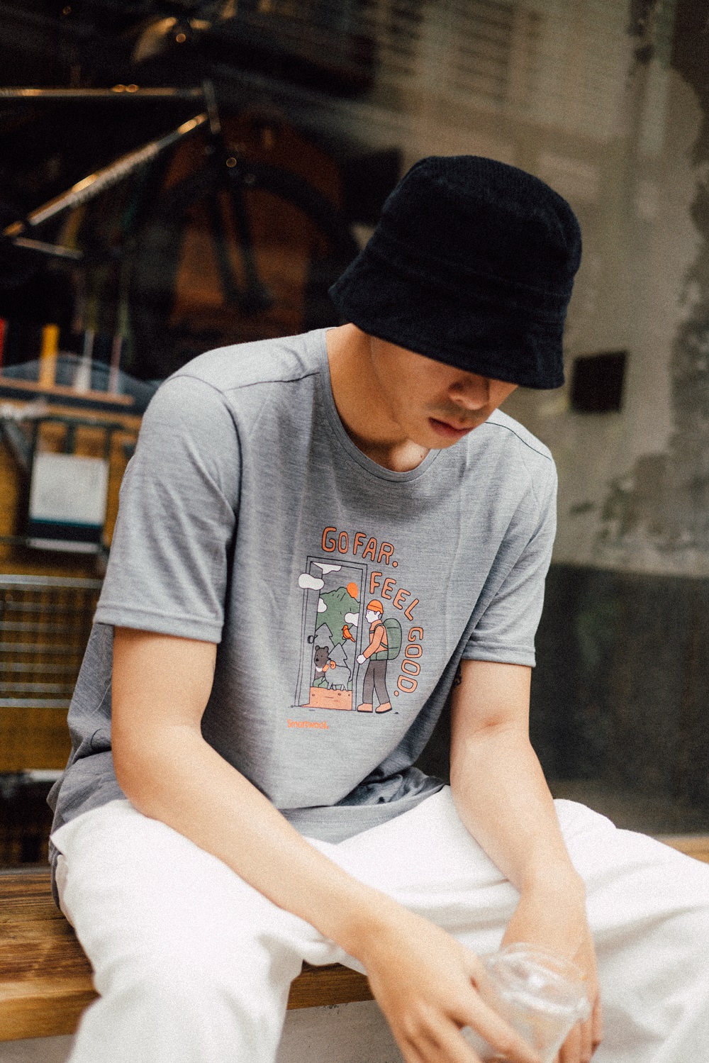 ▲穿上Smartwool 塗鴉Tee,在日夜溫差大的春夏季可搭配一件休閒襯衫,下身則以白色系為主,再戴上與襪子同為深色的漁夫帽,營造日系街頭感。