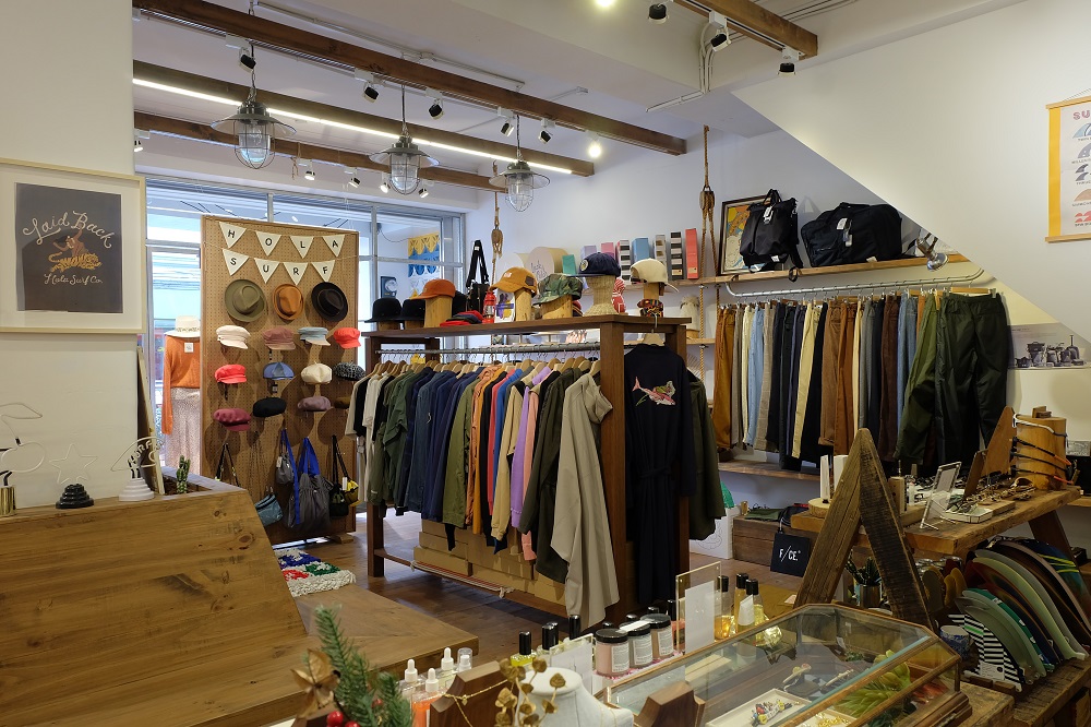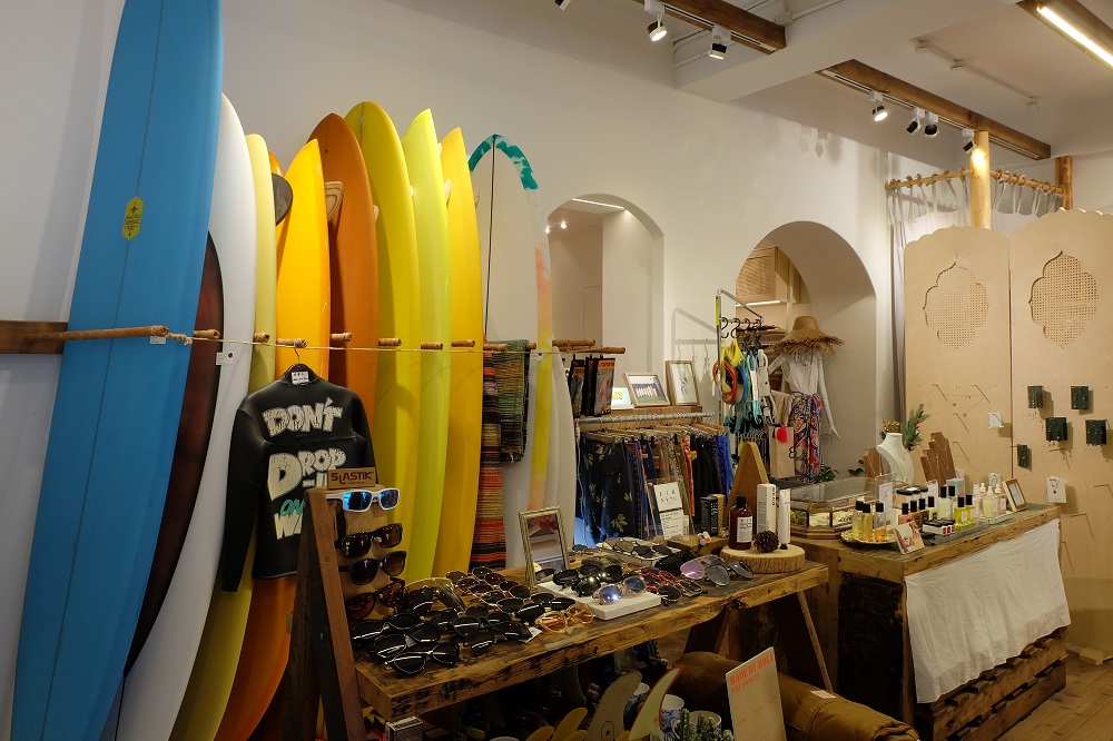 カリフォルニアやオーストラリアのカジュアルなものをセレクトし、サーフボードはヴィンテージのロングボードが中心です。プロフェッショナルウェアだけでなく、着回しのきくカジュアルアイテム,スイムウェア、アクセサリー、リゾートアイテム、環境に優しいサンオイルなど。