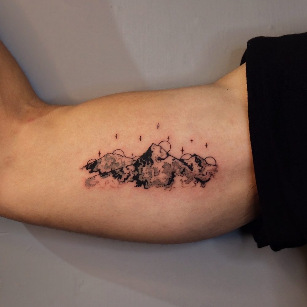 接著,他掀起右衣袖,展示右臂內側的刺青:「這是安納普納峰,這是八千高峰之中致死率最高的一座。她提醒我,死亡隨侍在側,永遠要敬畏高山。」