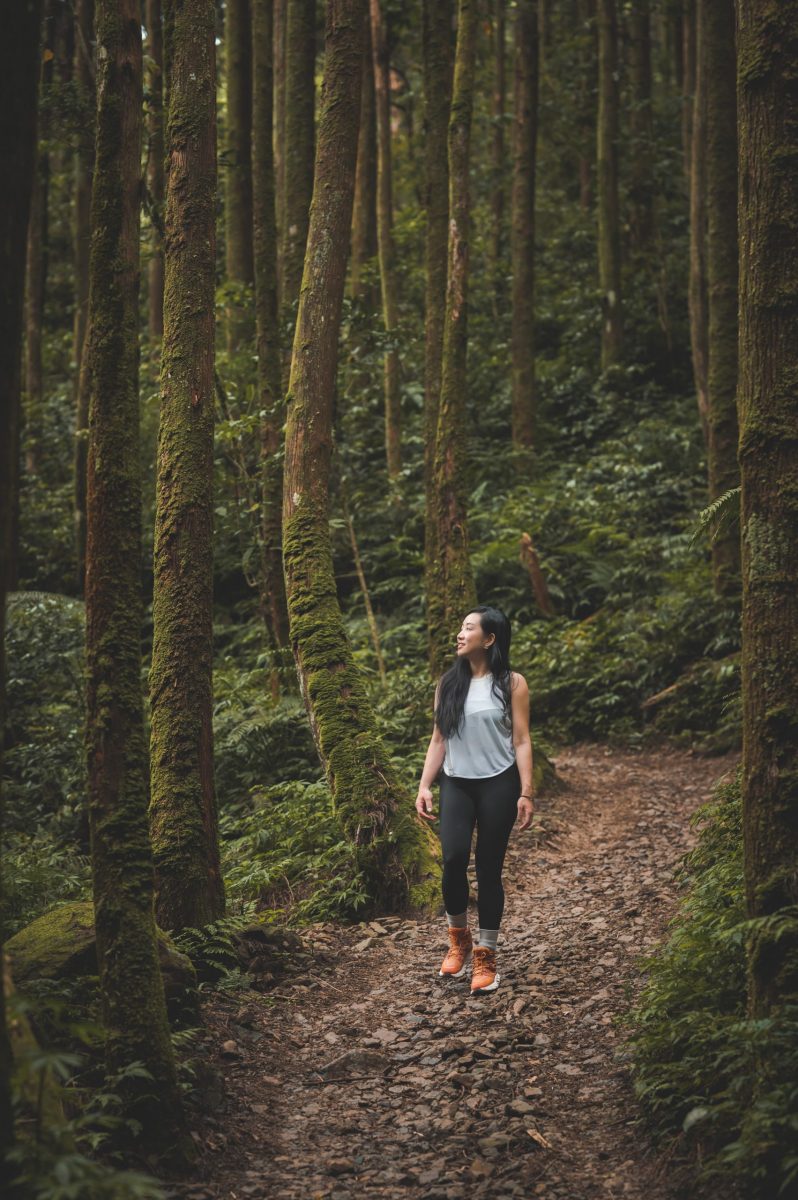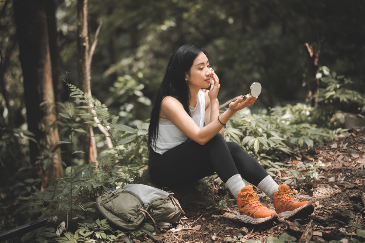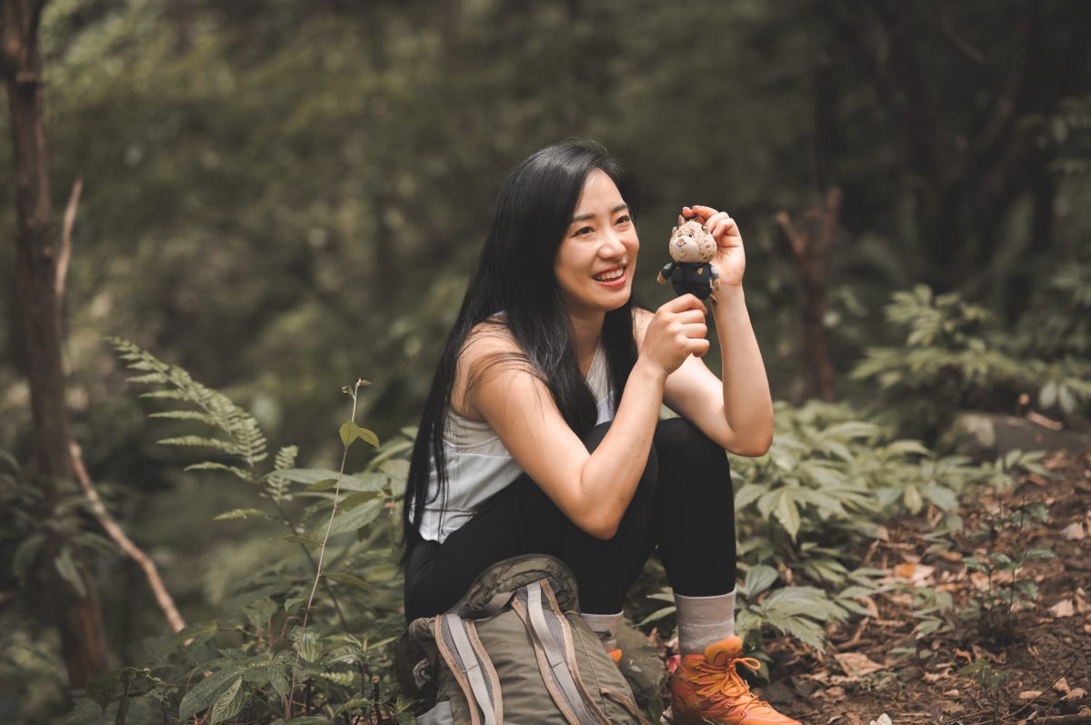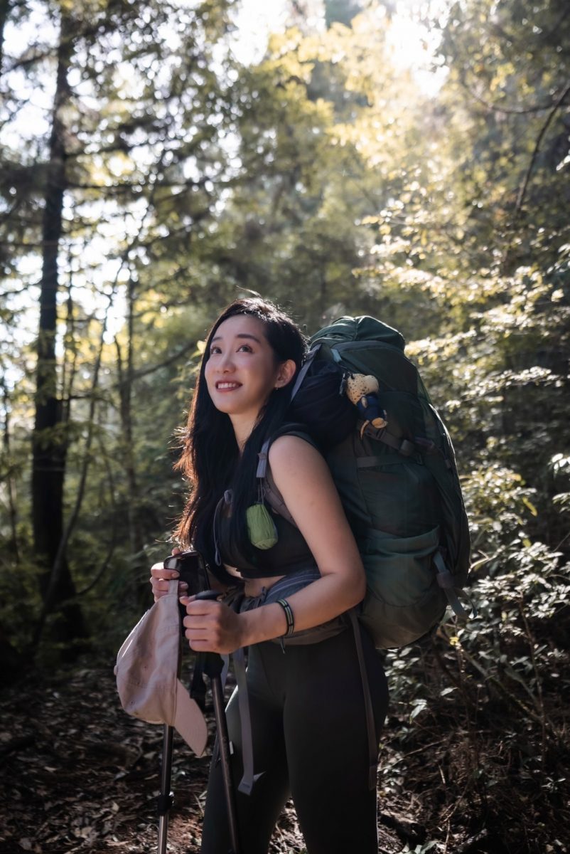 穿著帥氣的登山鞋,搭配完美的妝容,Jenny 以美美地姿態享受山林的懷抱。