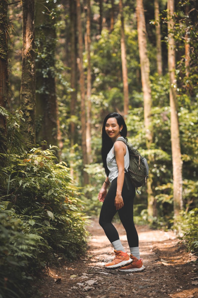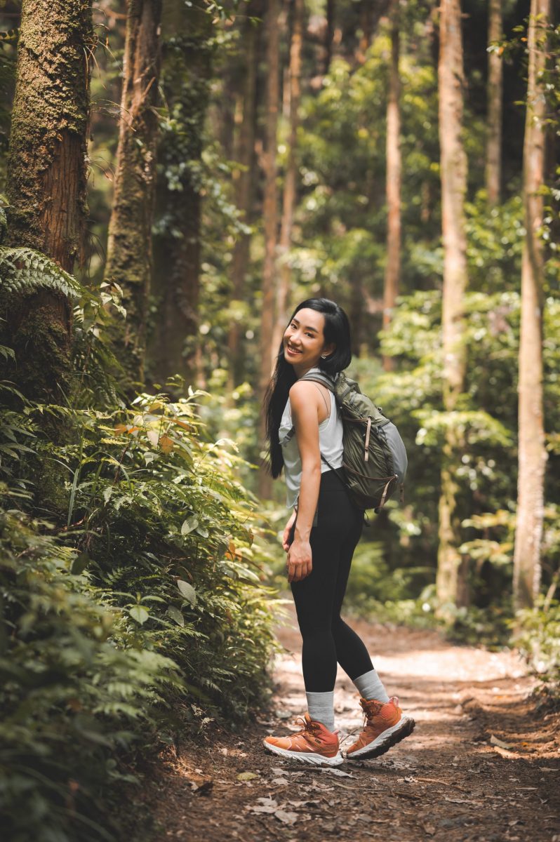她這天腳上穿的是 HOKA Anacapa GTX 輕量防水登山鞋,單隻只有 400 多克,非常輕。「HOKA Anacapa GTX 輕量防水登山鞋真的好輕,跟我以前穿的重裝登山鞋相比,這雙輕到一個不可思議的地步,可以大大減輕雙腳負擔。雖然輕,但它的機能性也很夠,它有 Gore-tex 防水,鞋底也是用 Vibram Megagrip 黃金大底,抓地力非常好。像我走在這種比較溼滑的泥徑都不會有快滑倒的感覺,很心安。」