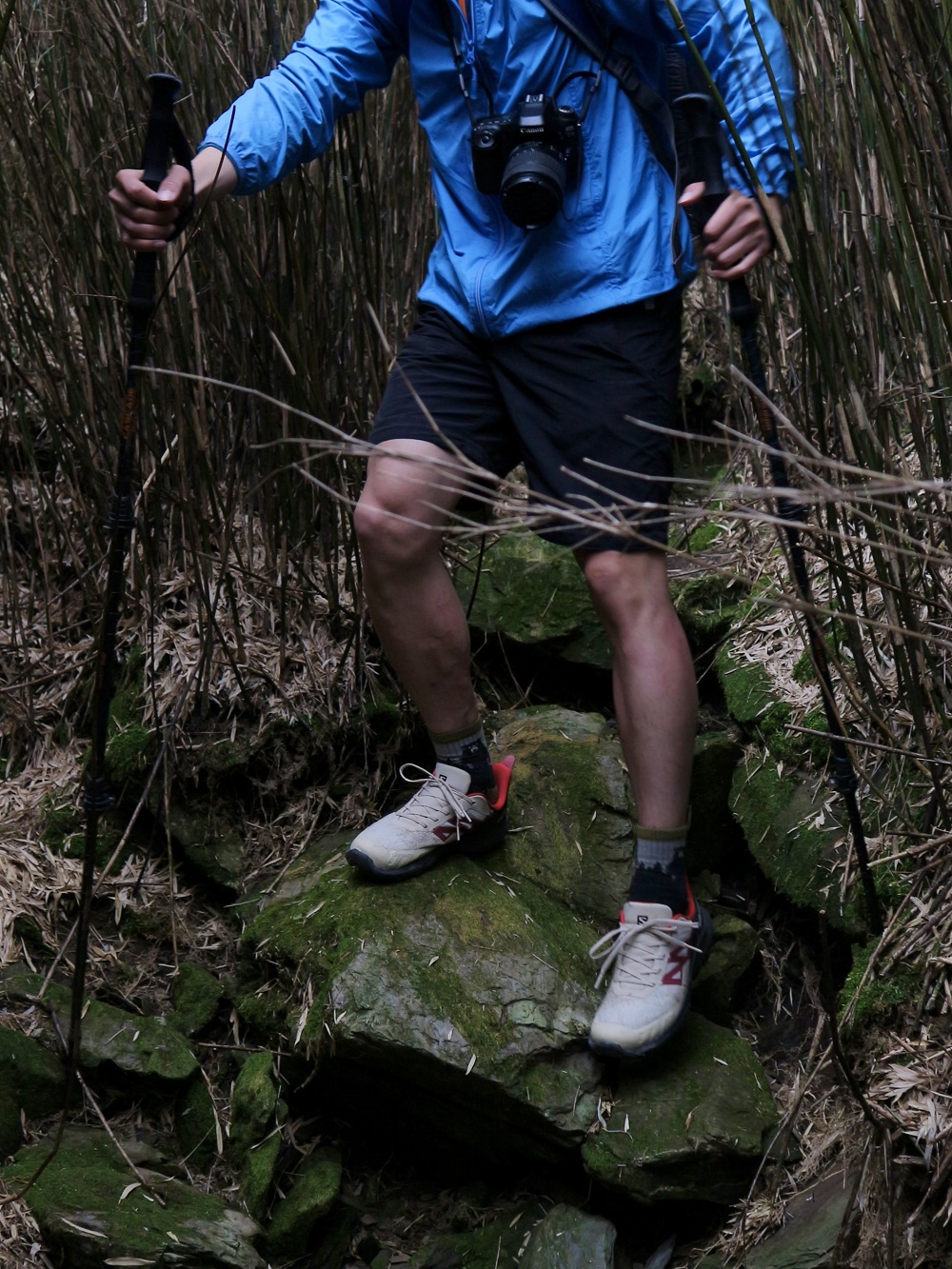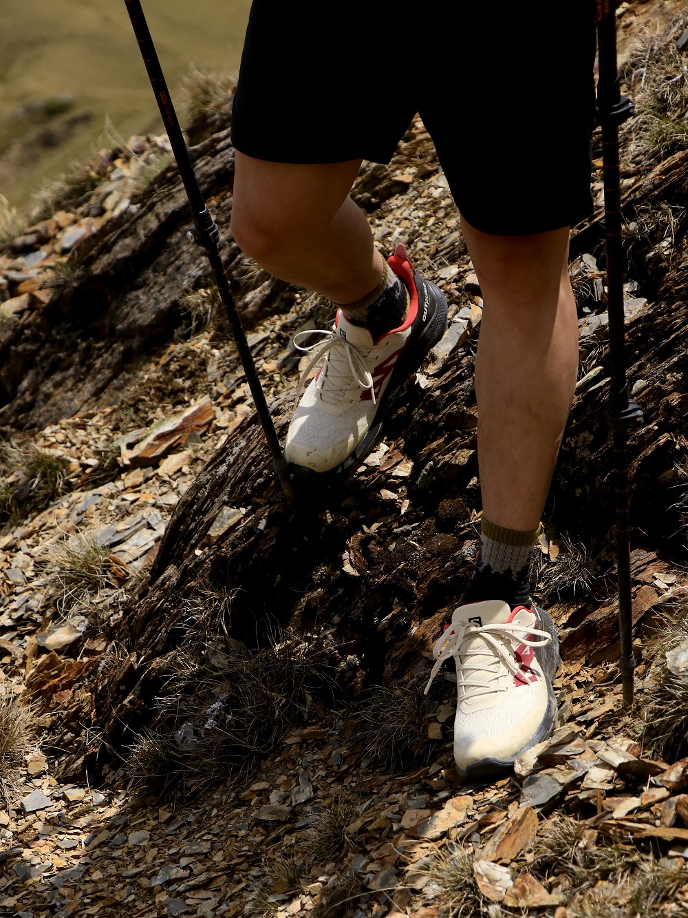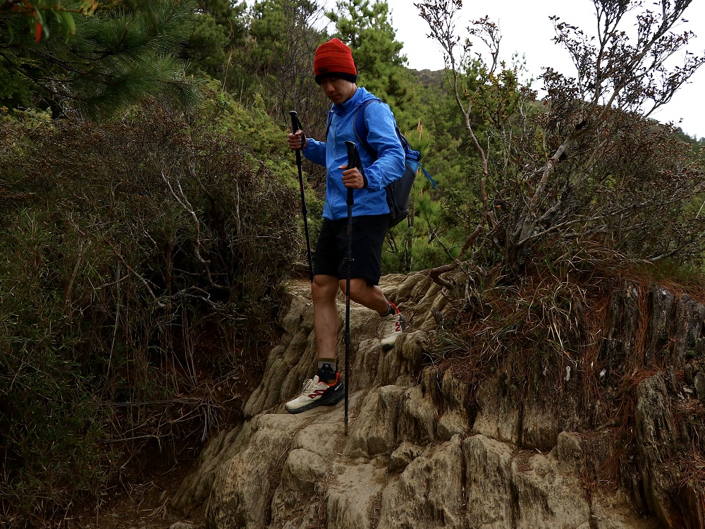 回程下山時,我們再度來到頭一公里的陡坡區,只不過這次換成了陡下。對於必須持續緩衝重量、維持穩定的連續陡下坡來說,Salomon OUTpulse GTX鞋底還是稍軟了些,不像重裝登山鞋那樣能直接頂住全身重量,我們在大腿無感的情況下,小腿都感受到了些許的疲勞。