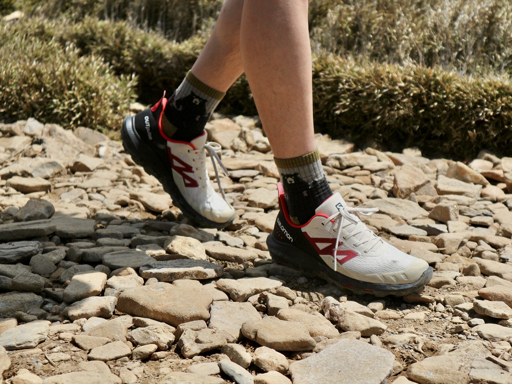 走上熟悉的百岳高山環境,最能感受到產品的各項特性對於自己身體的影響程度。實際穿著Salomon OUTpulse GTX走在步道上,能感受到它兼具傳統登山鞋的穩定度,以及跑鞋的輕盈、推進能力,即使是走在硬梆梆的柏油路面,也能舒適地持續行走不致疲累。我們從先前的重裝經驗裡綜合評估,覺得若穿這雙去走奇萊南華或大霸尖山,或許就不必再擔心那些又臭又長的林道讓雙腳又痛又麻了!