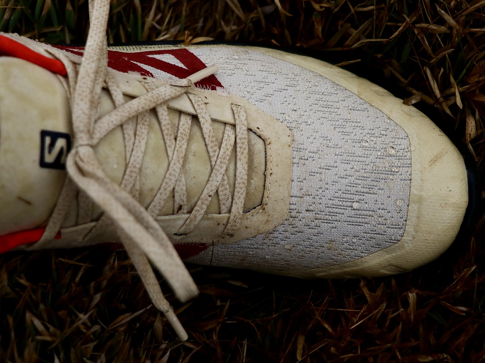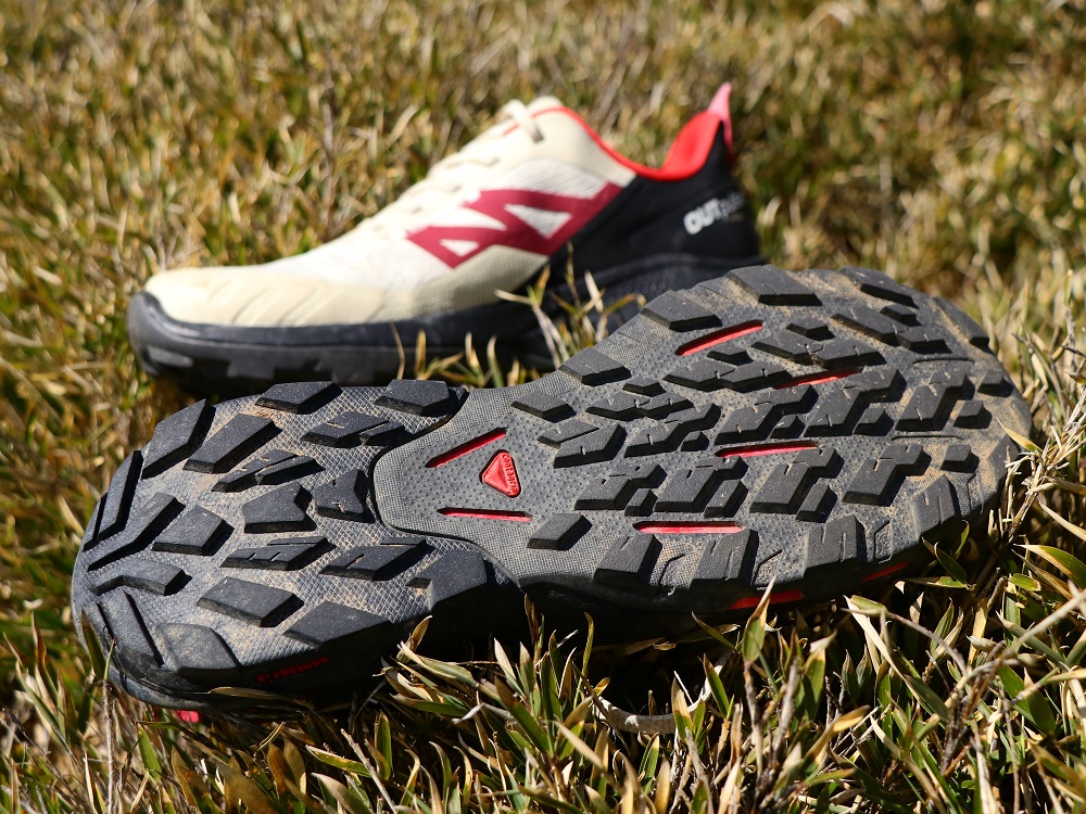 與Salomon其他鞋款之Contagrip®抓地大底相比,OUTpulse GTX在鞋底顆粒設計上較為瘦長,且偏縱向排列,方便快速行走。筆者之前所穿的硬底登山鞋,鞋底顆粒為多牙狀,分布也較為平均,因此OUTpulse GTX有更顯著的推進感,且仍保留Contagrip®良好的抓地能力。