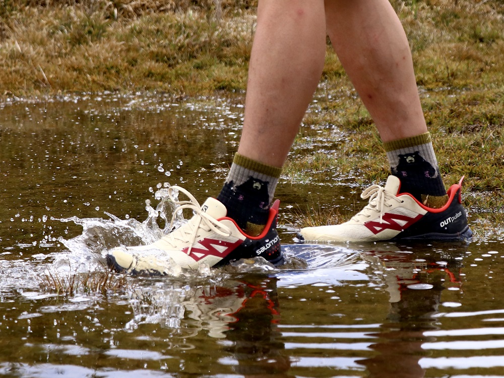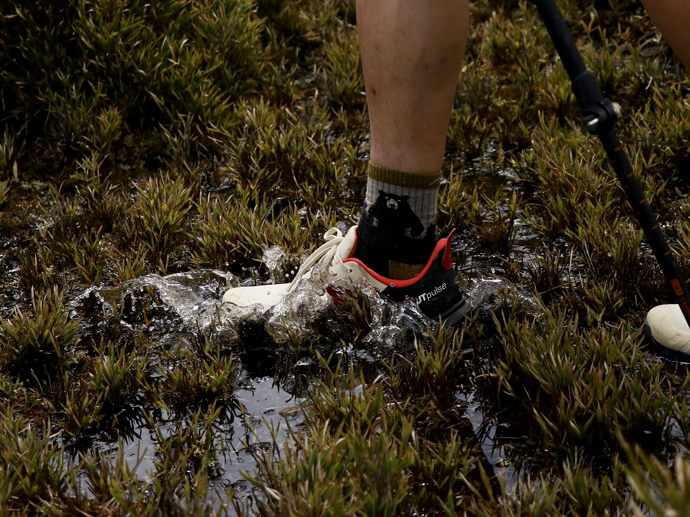 GORE-TEX兼具透氣、防水的特性,向來是登山風雨衣的首選面料。將同樣的材質用在鞋面,不管是行進間的腳掌出汗、踩到泥濘或水窪時的噴濺,透過GORE-TEX能有效保持雙腳的乾爽。踩過水坑後,即使有點被噴濕,鞋頭的GORE-TEX面料仍有效阻隔水分。