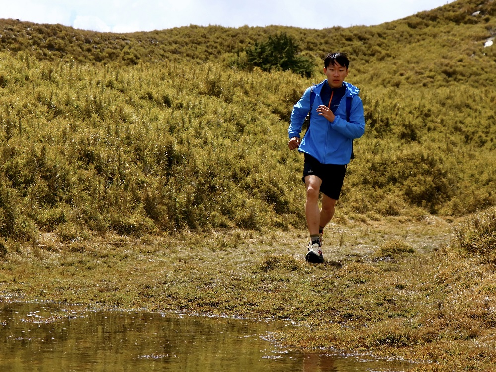 由於少有人踩過這片草原,底土與強韌的箭竹令地面顯得凹凸不平。沙沙平時運動量不若我大,腳踝穩定度也沒像固定練足球的我那麼強,因此背重裝都是穿著堅硬的高筒登山靴因應,走這種連續波浪狀凹凸的地面稍嫌吃力,小小扭了幾下;相較之下,我倒還走得輕鬆自在,只覺得彈性十足的鞋底踩在箭竹上走起來特別舒服!