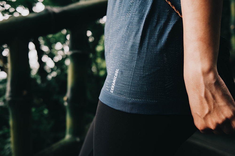 這件因有 Body Mapping 的設計、以及 Ceramicool 陶瓷涼感紗線的加持,可以在最短時間內將身體累積的汗水和熱氣蒸散,還能讓體感溫度快速的下降。