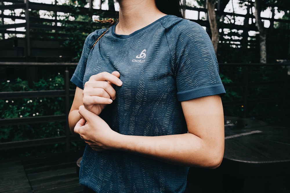 Odlo 以無縫編織的技術及 Body Mapping 的概念,在同一件衣片的不同部位做處理,這樣的設計和面料結構可以幫助透氣排汗,在最短時間內將身體累積的汗水和熱氣,迅速擴散蒸發,讓身體保持乾爽。