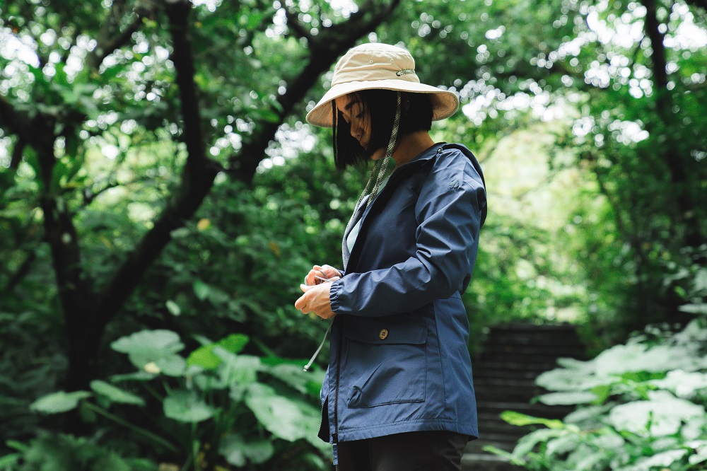 ▲行進到途中,雖然雨勢趨緩,但只要一陣風來襲,瞬間將樹上的積水吹落,外套也能發揮防潑水功能。
