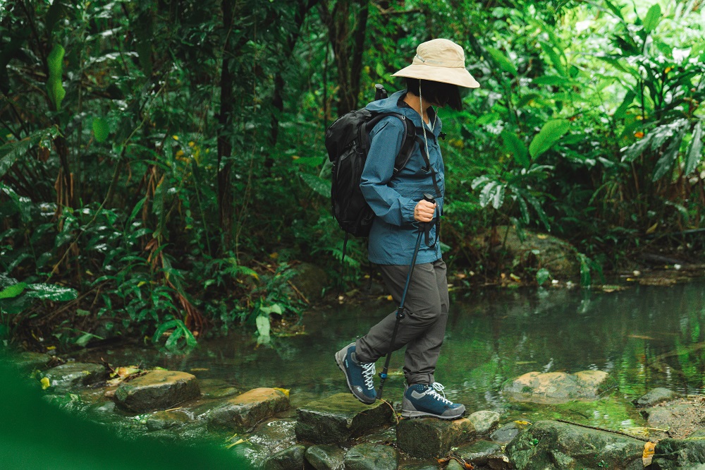 ▲當天行走濕滑的石階,Edith不慎整隻腳踩進溪水中,除了襪子濕掉之外,鞋面及身穿的Lafuma SHIFT 快排彈性長褲皆迅速恢復乾爽。