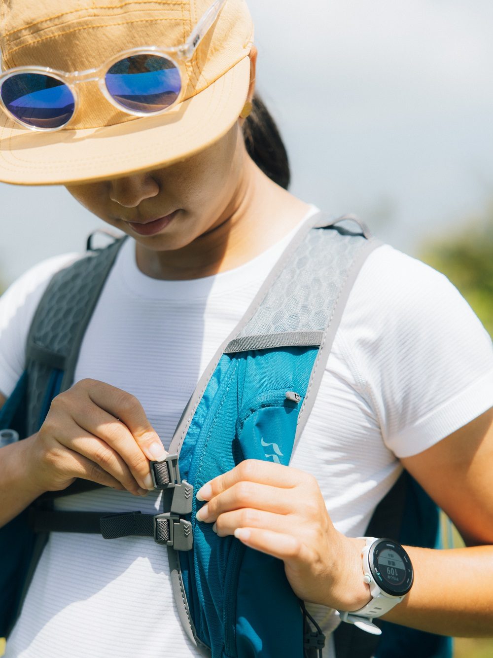 - 背心式的肩帶雙胸扣設計,在快速行進間會更加安全,右前方置物空間可放置隨身軟水壺,能快速補充水分與能量。